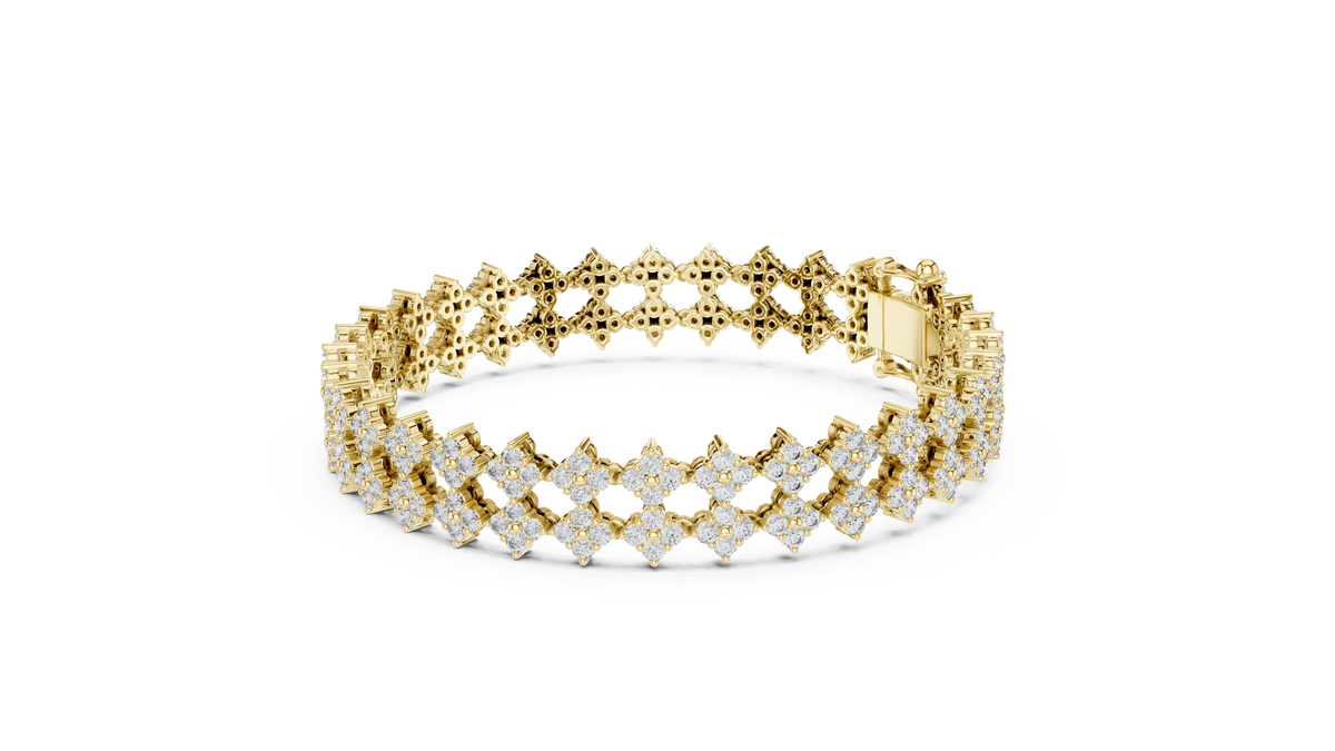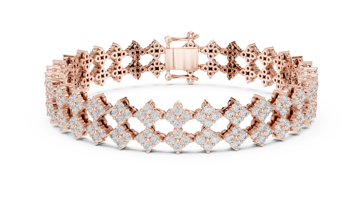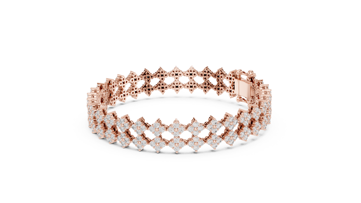 • The image depicts a rose gold bracelet adorned with diamonds, featuring a clasp at the back. The bracelet is crafted from rose gold and boasts a repeating pattern of diamond-studded flowers or stars that are interconnected to form a flexible band.