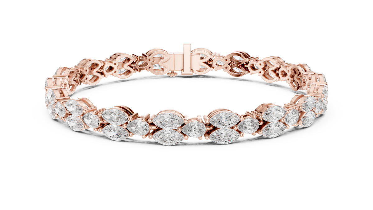 • The bracelet features a rose gold setting that securely holds the diamonds in place, with a clasp at the back for easy fastening. The diamonds are arranged in a pattern that adds to the overall aesthetic appeal of the piece, making it a stunning accessory for any occasion.