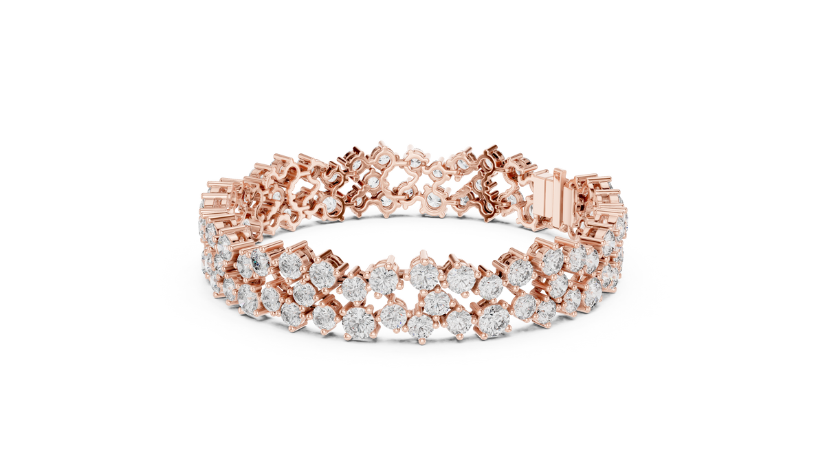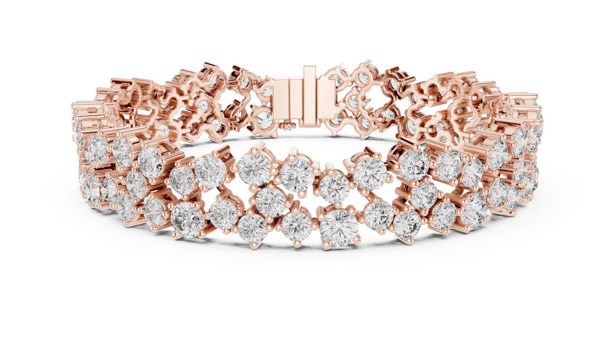 • The image depicts a luxurious rose gold bracelet adorned with numerous diamonds, showcasing its intricate design and craftsmanship. The bracelet features a rose gold setting that securely holds the diamonds in place, creating a stunning visual effect. The diamonds are arranged in a multi-strand pattern, adding to the overall opulence of the piece. The rose gold clasp is visible at the center of the bracelet, providing a secure and elegant fastening.