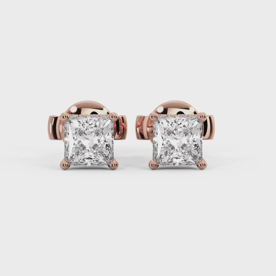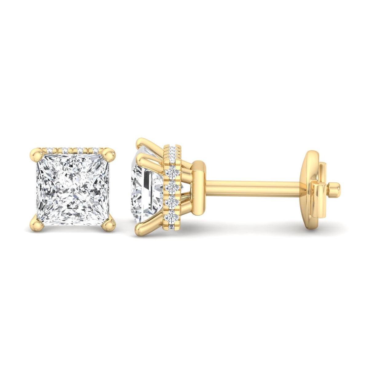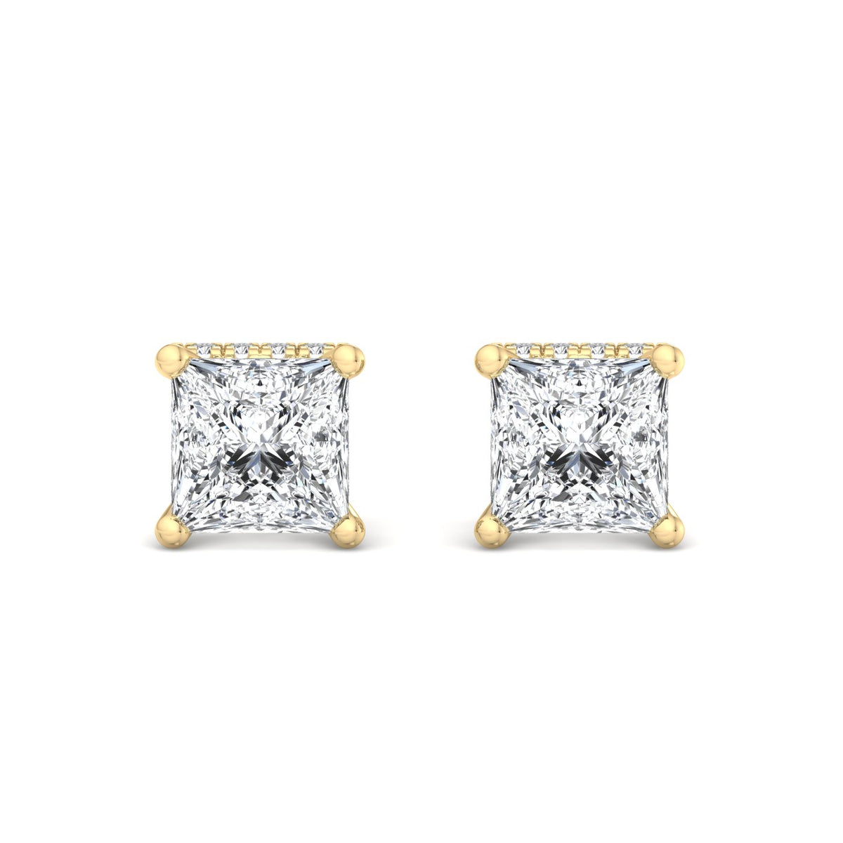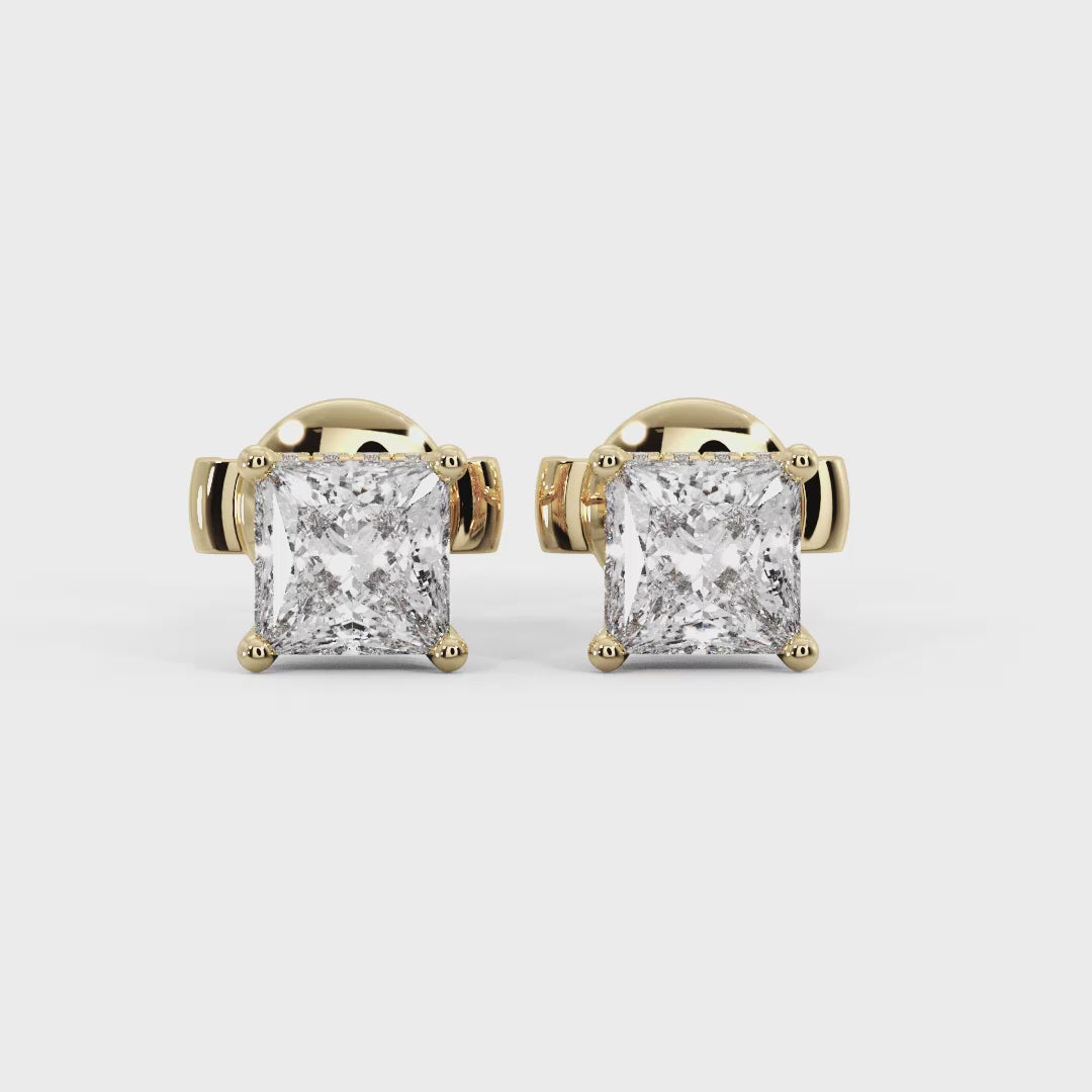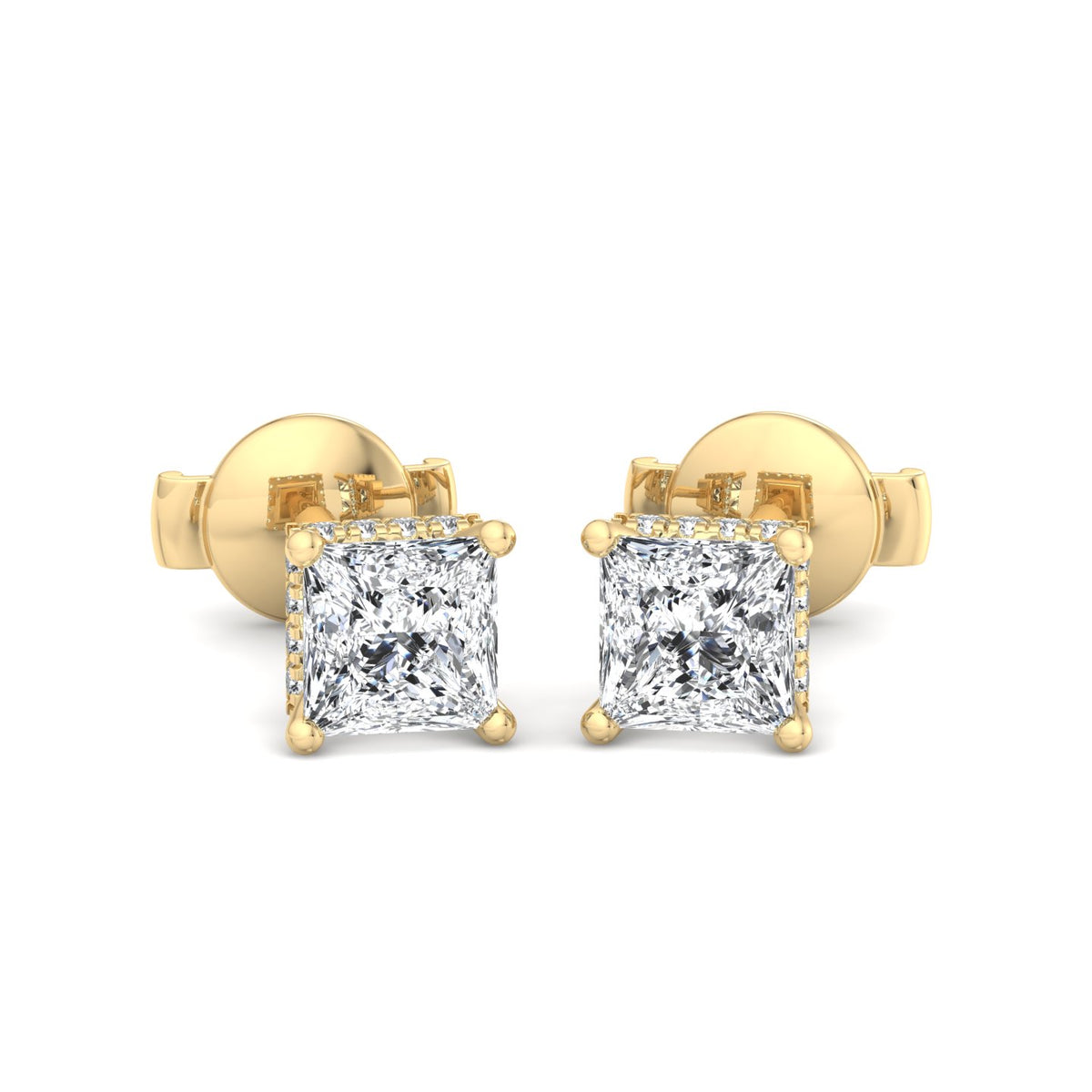 Command attention with the regal allure of Crowned Brilliance, where modern geometry meets timeless sparkle. These stunning stud earrings feature bold princess-cut diamonds, renowned for their clean edges and intense fire. Set in rich yellow gold, each central diamond is framed by a delicate halo of micro-pavé-set accent stones along the sides, adding dimension and enhancing the radiance from every angle.