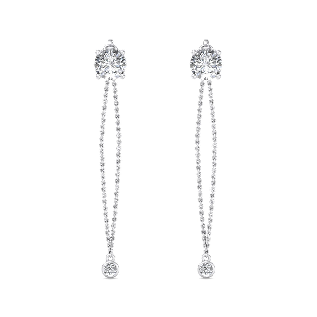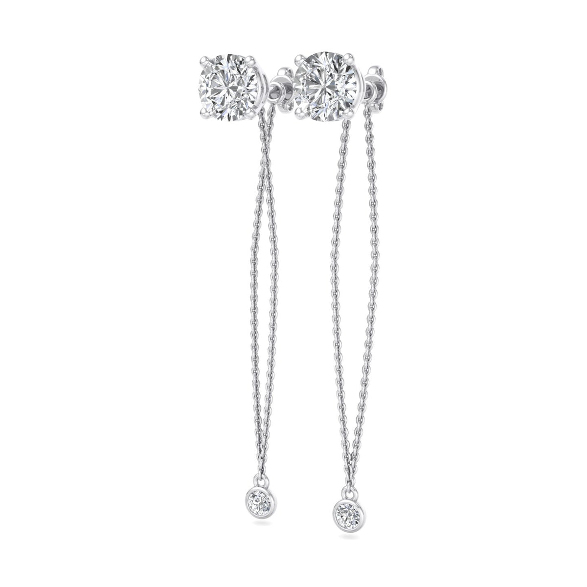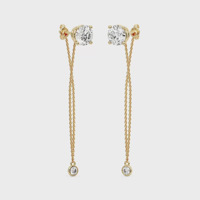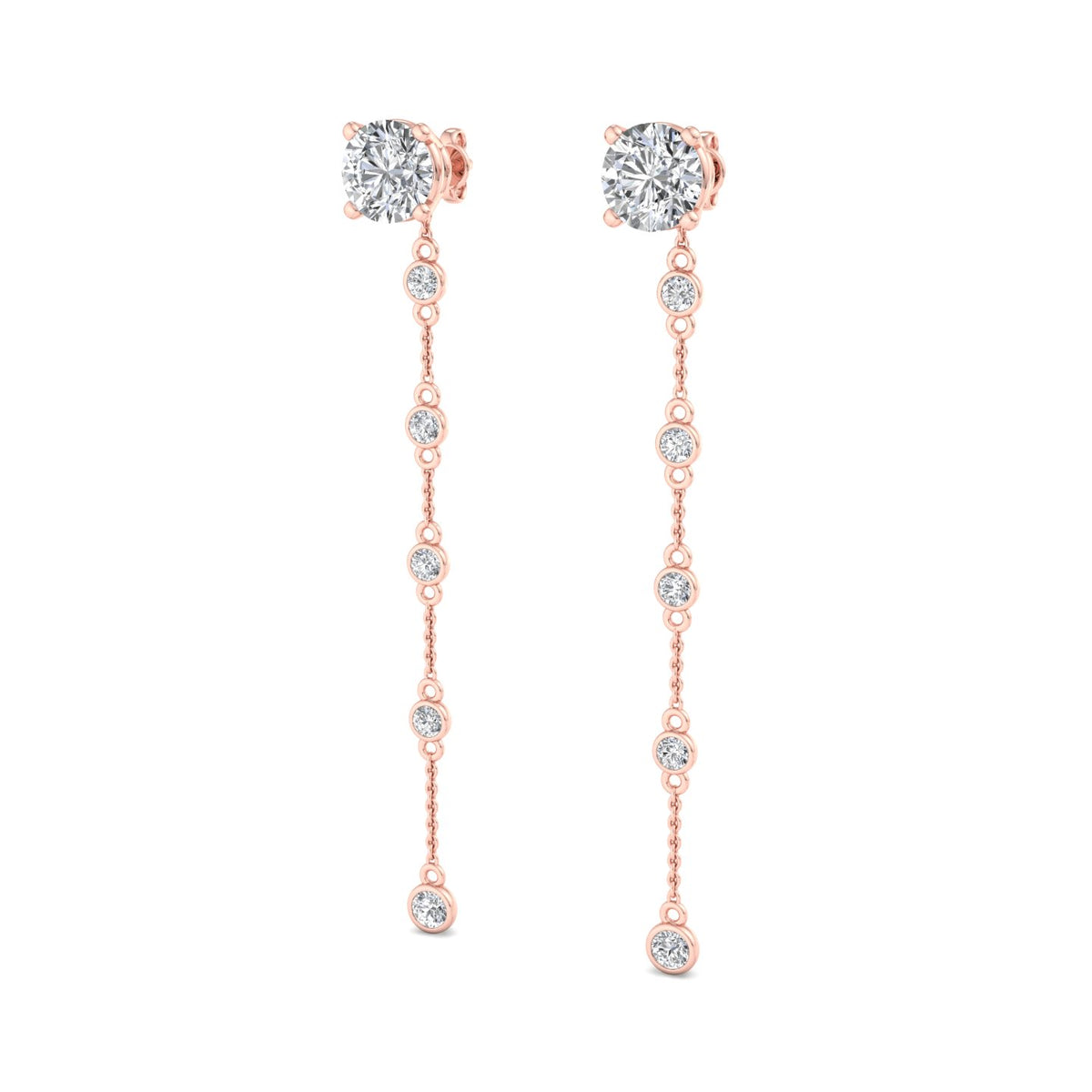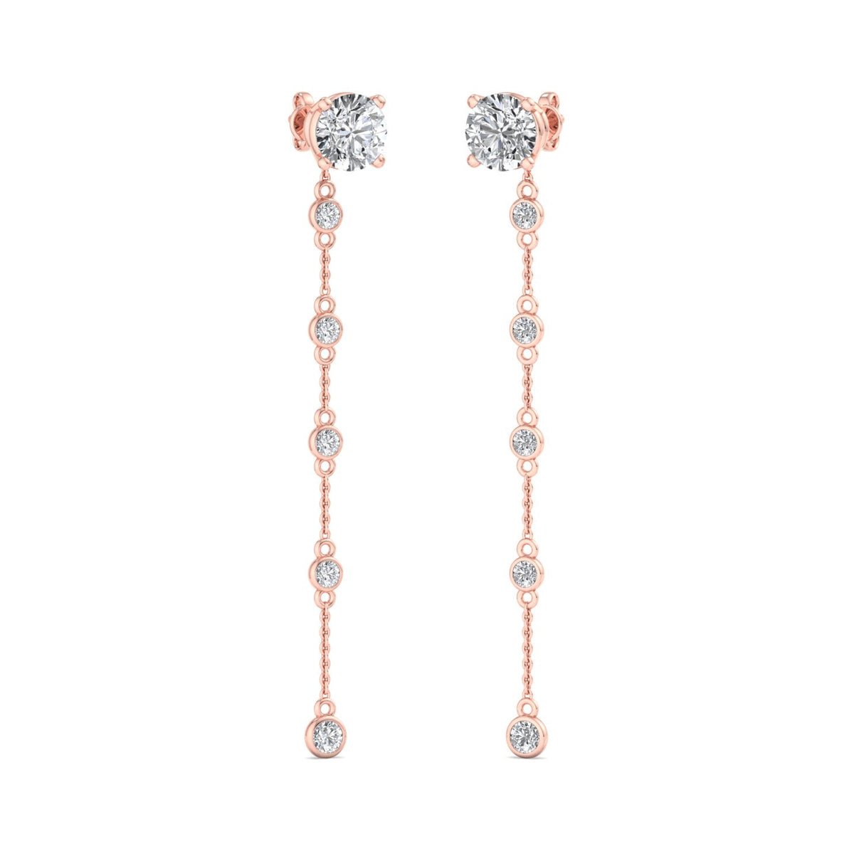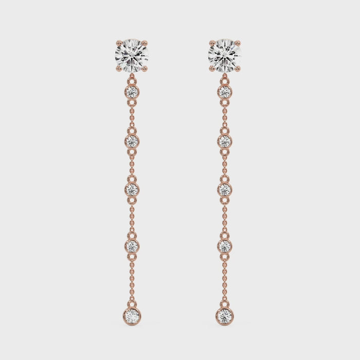 These earrings feature a round diamond stud at the top, set in rose gold, and are complemented by a delicate rose gold chain that extends downwards. The chain is adorned with a smaller round diamond at its end, adding a touch of elegance and sophistication. The rose gold setting gives the earrings a warm, luxurious appearance, while the diamonds provide a brilliant sparkle. The overall design is simple yet refined, making these earrings suitable for both everyday wear and special occasions.