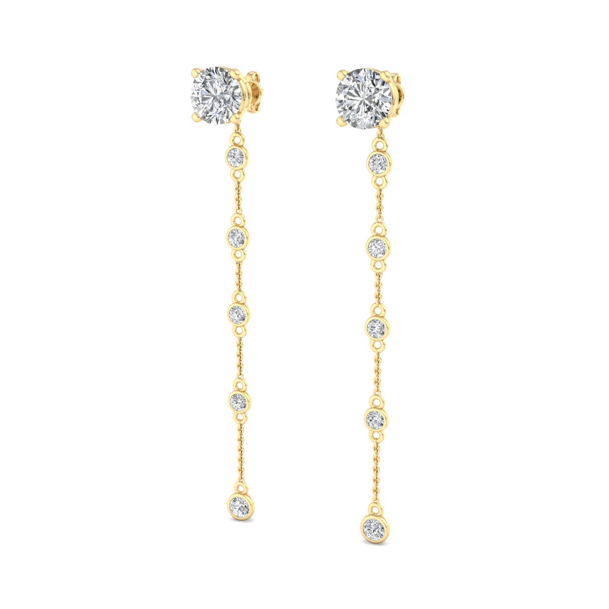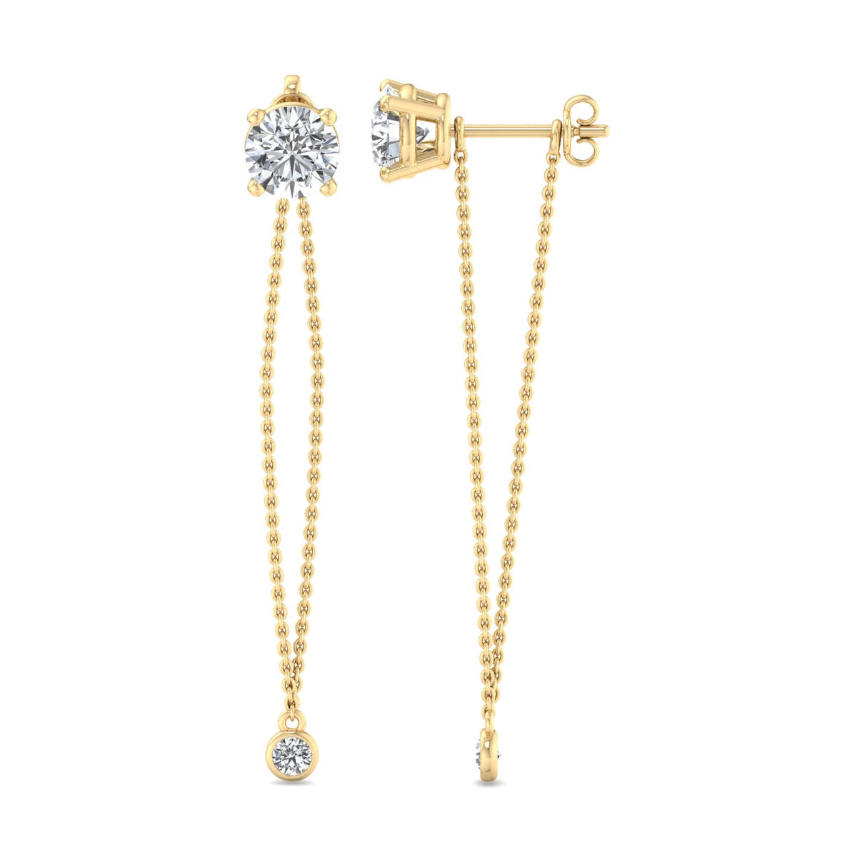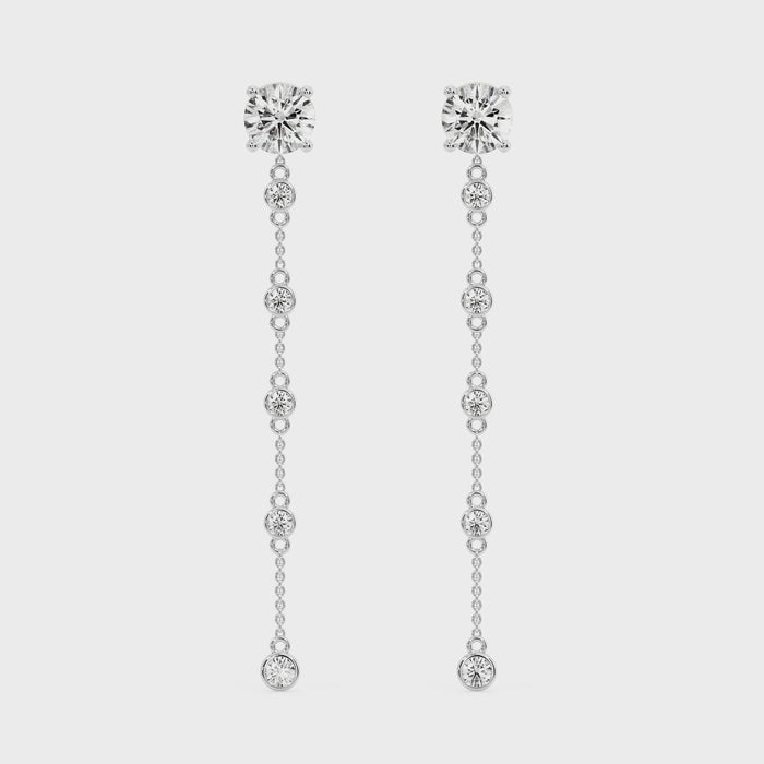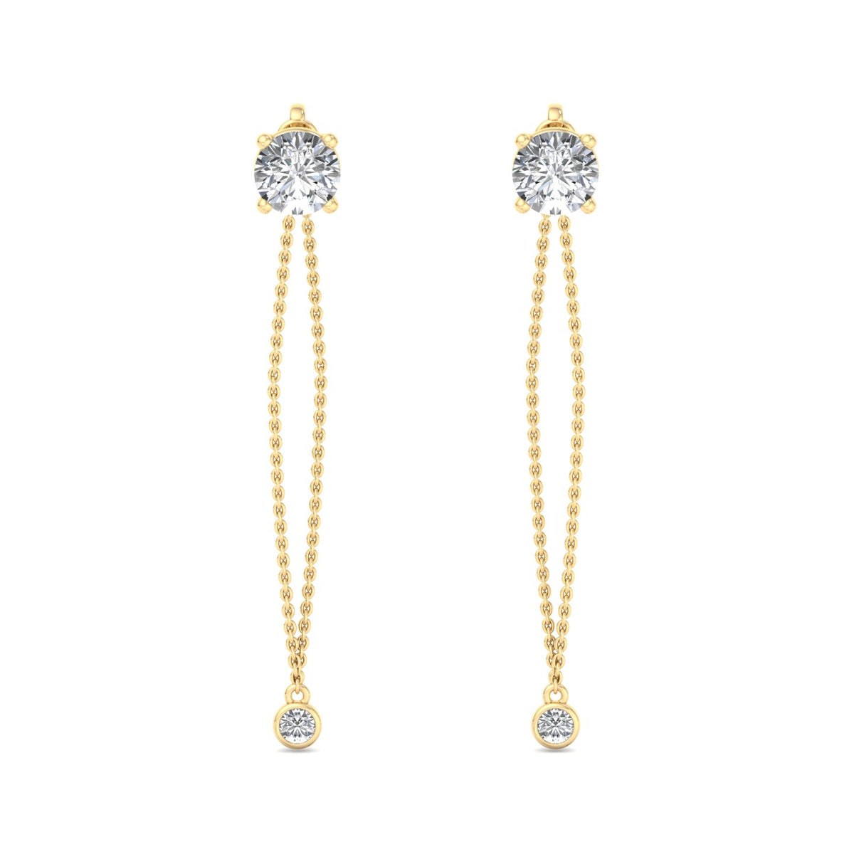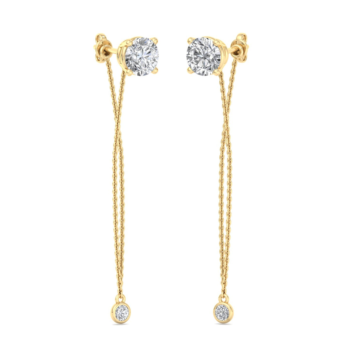 These earrings feature a round diamond stud at the top, set in rose gold, and are complemented by a delicate rose gold chain that extends downwards. The chain is adorned with a smaller round diamond at its end, adding a touch of elegance and sophistication. The rose gold setting gives the earrings a warm, luxurious appearance, while the diamonds provide a brilliant sparkle. The overall design is simple yet refined, making these earrings suitable for both everyday wear and special occasions.