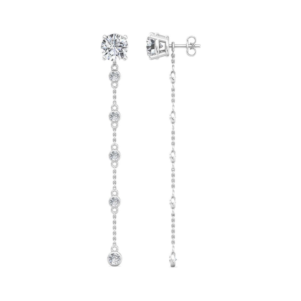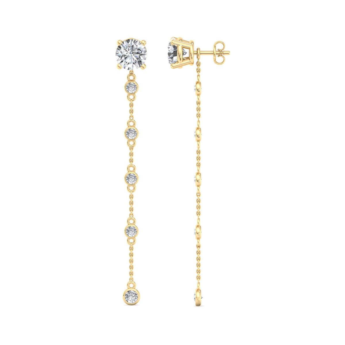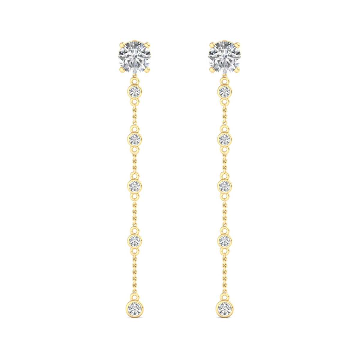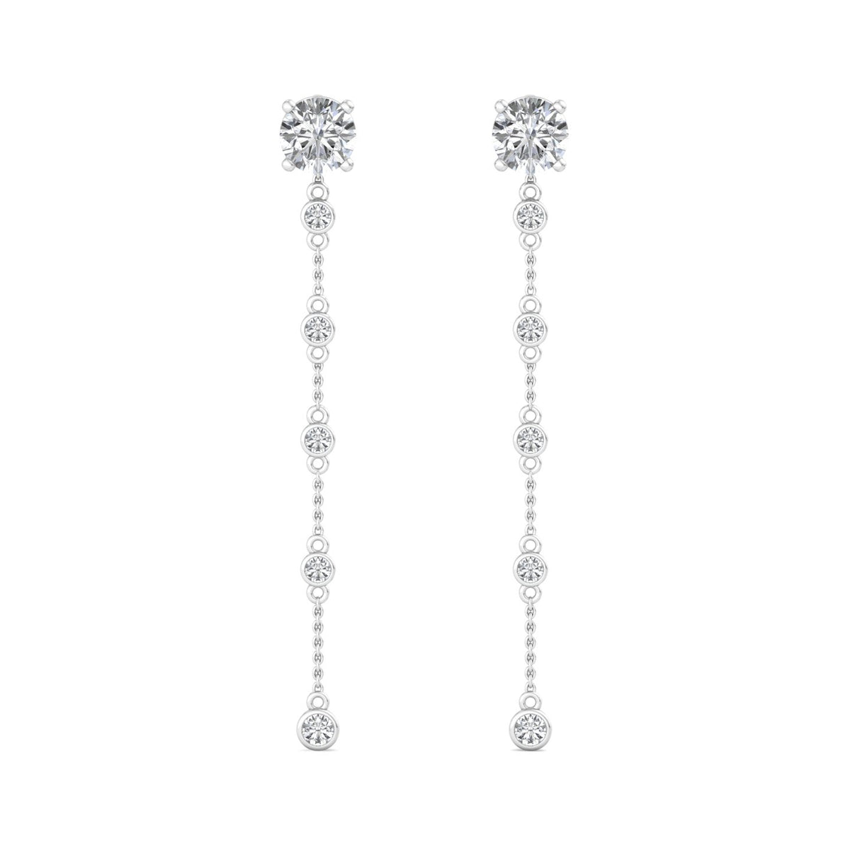 These earrings feature a round diamond stud at the top, set in rose gold, and are complemented by a delicate rose gold chain that extends downwards. The chain is adorned with a smaller round diamond at its end, adding a touch of elegance and sophistication. The rose gold setting gives the earrings a warm, luxurious appearance, while the diamonds provide a brilliant sparkle. The overall design is simple yet refined, making these earrings suitable for both everyday wear and special occasions.