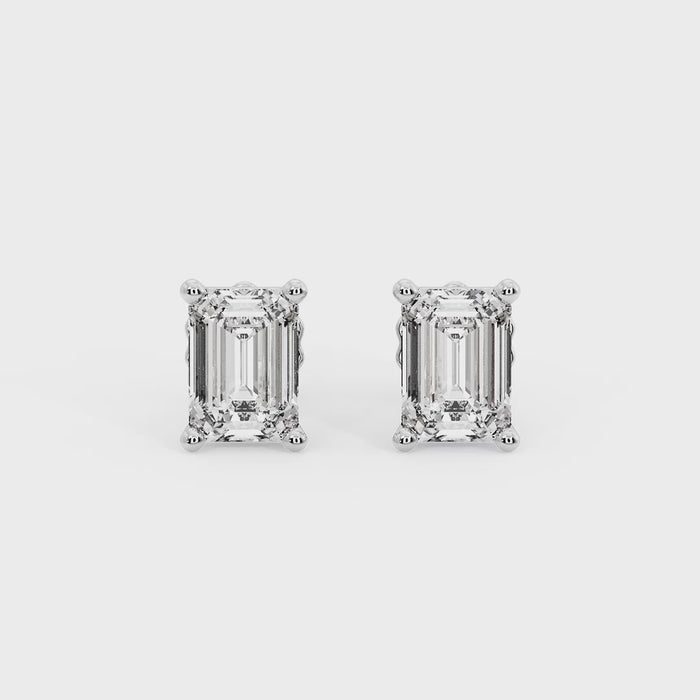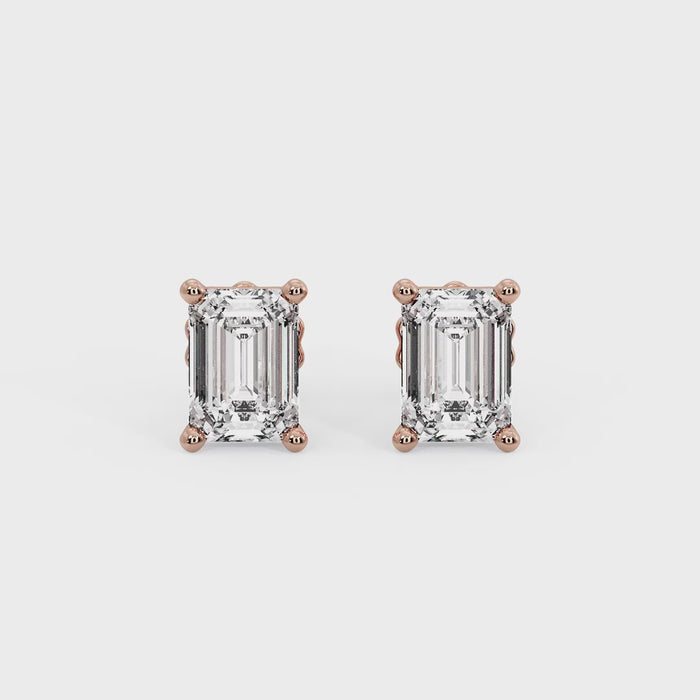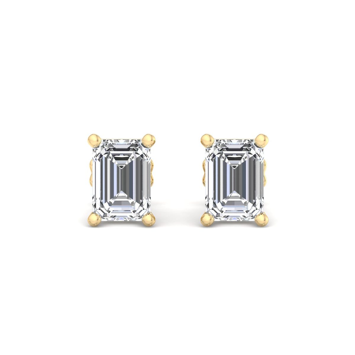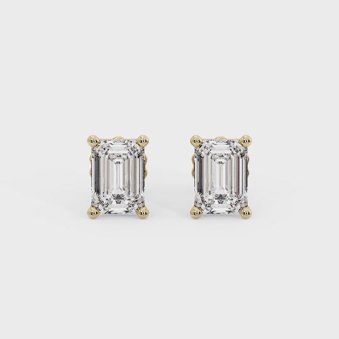 The diamonds are rectangular in shape with stepped faceting, giving them a classic and sophisticated appearance. They are securely set in a four-prong gold setting, which not only holds the stones in place but also adds a touch of luxury to the overall design.