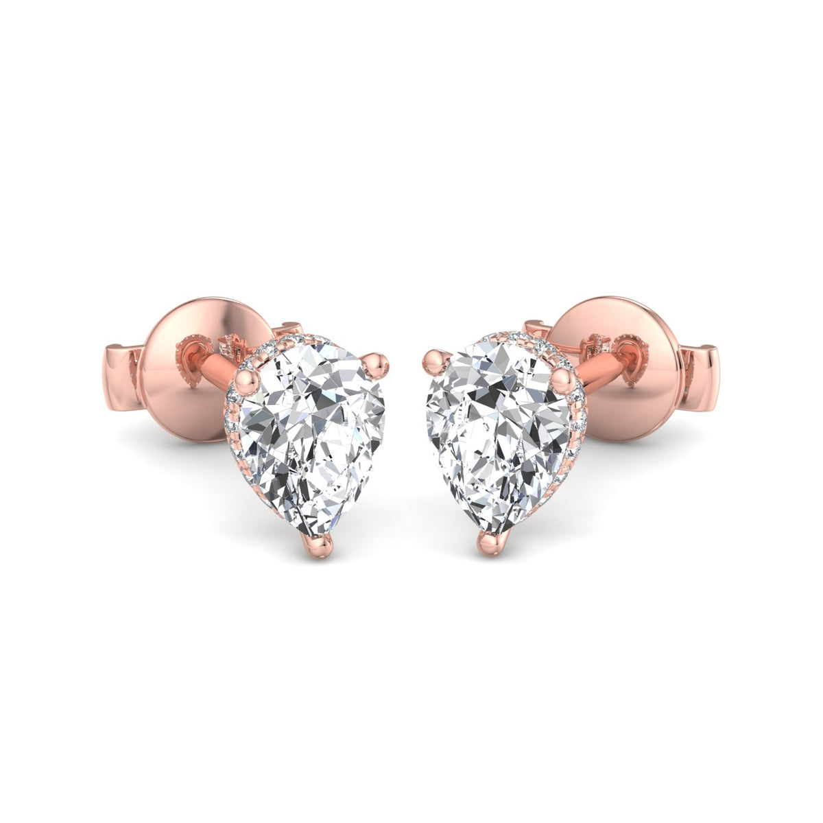 The image depicts a pair of earrings featuring heart-shaped diamonds set in rose gold. The diamonds are securely held in place by four prongs, and the earrings are designed with a stud style, complete with a post and backing. The overall aesthetic is one of understated elegance, making them suitable for everyday wear or as a special occasion accessory.