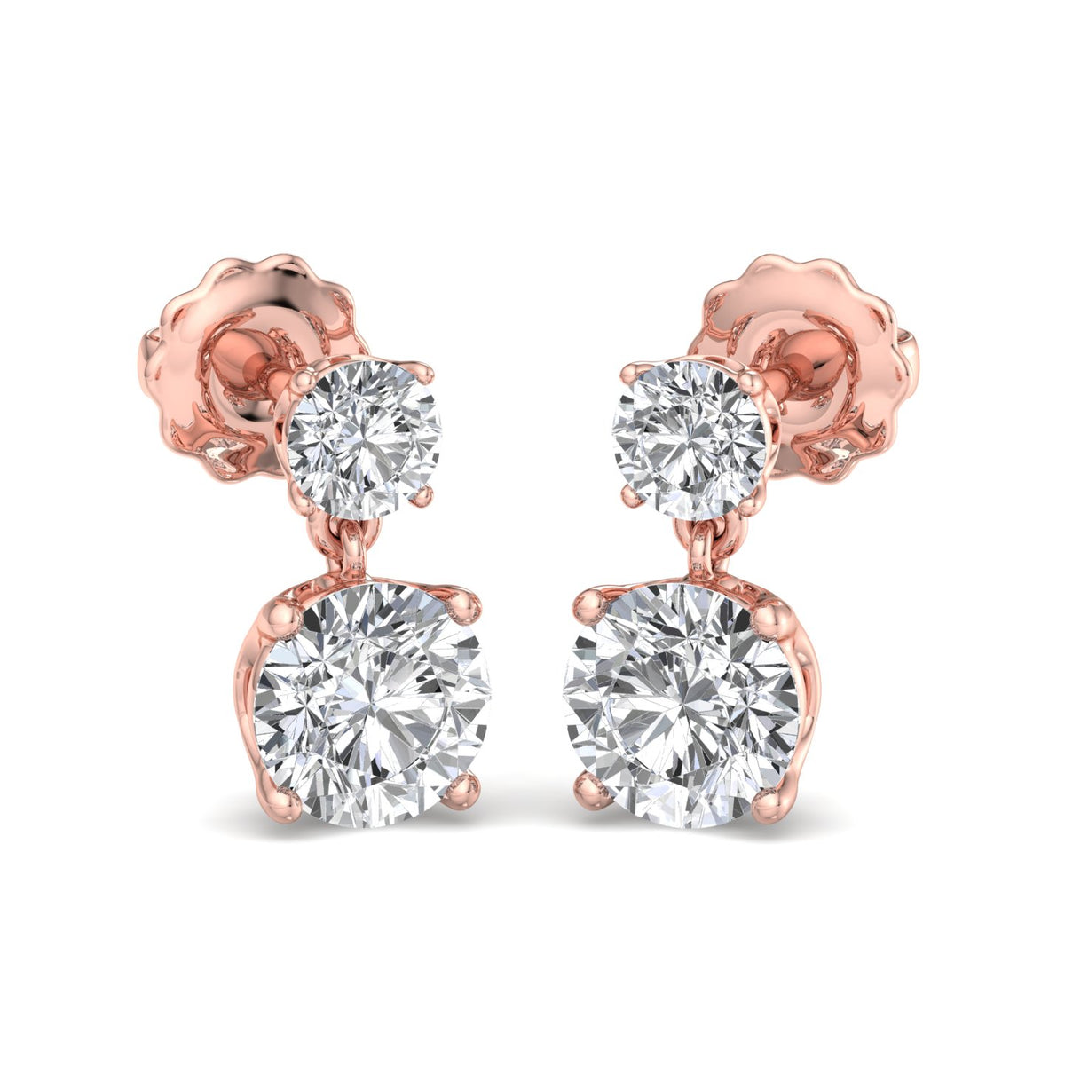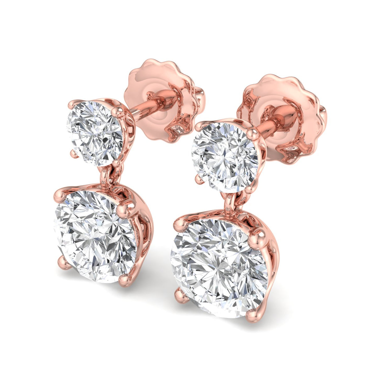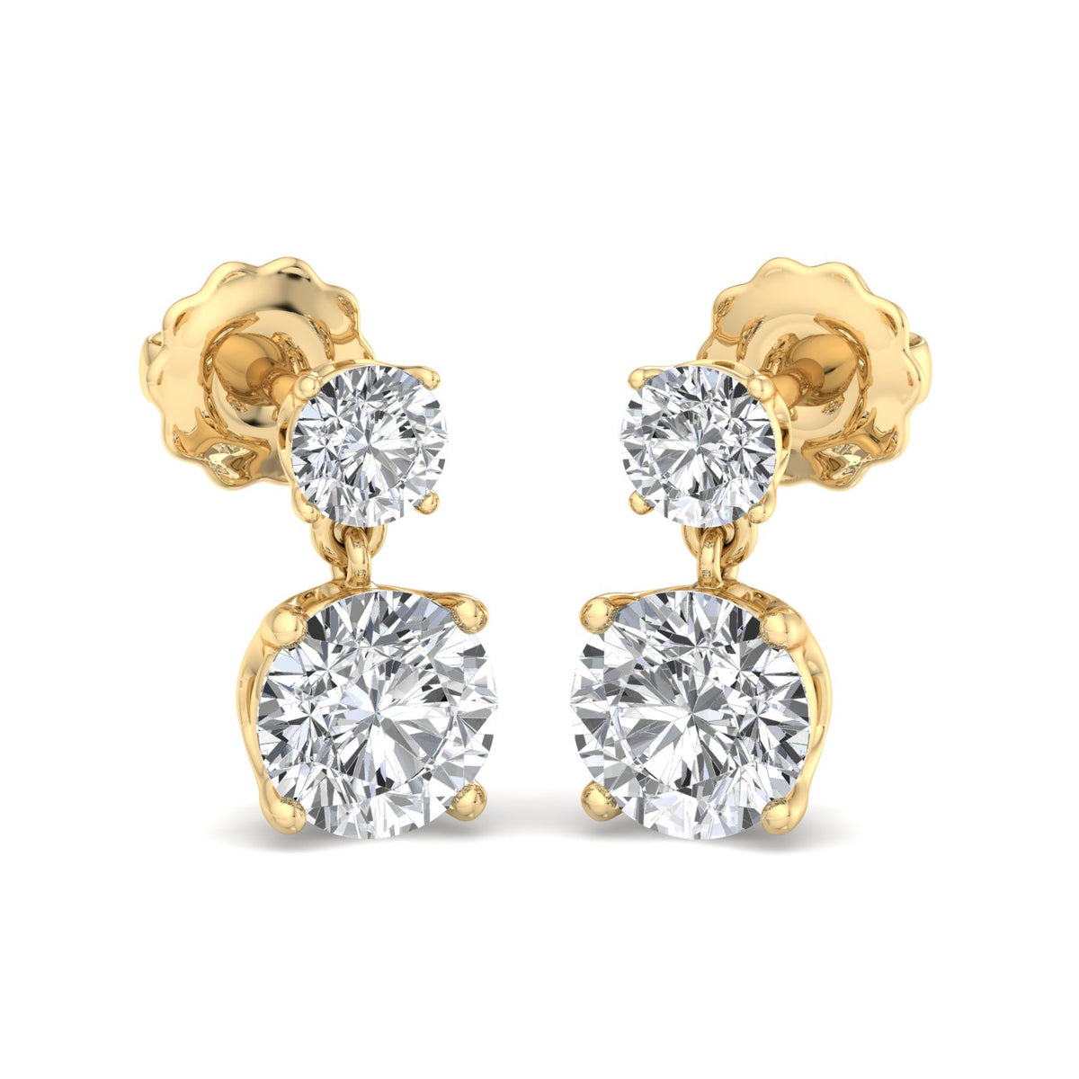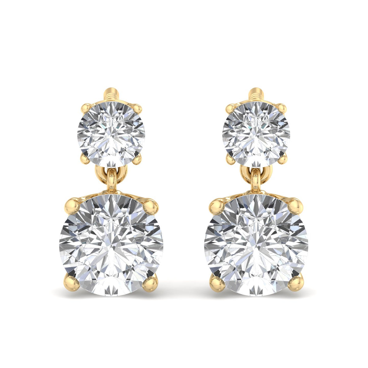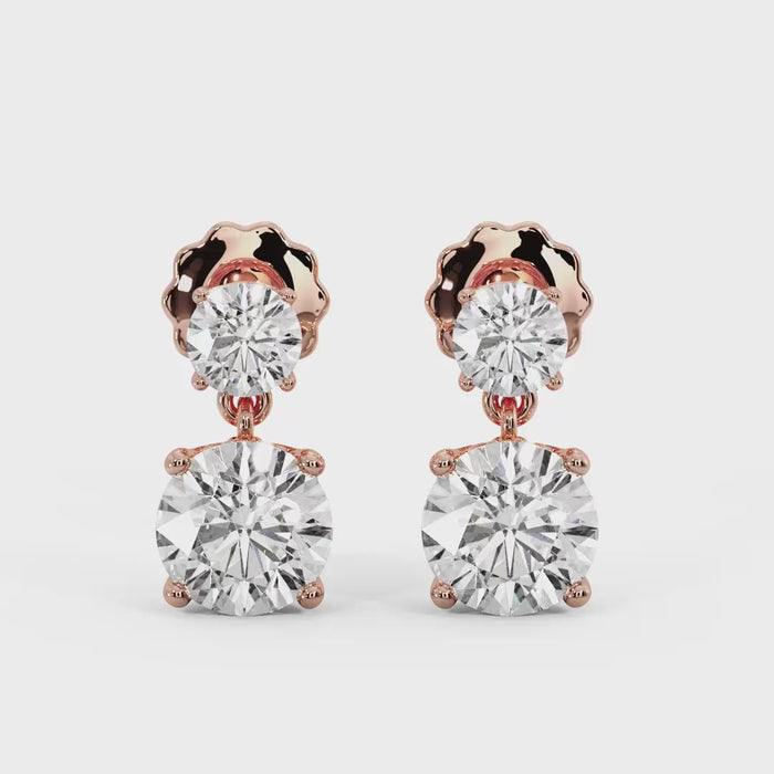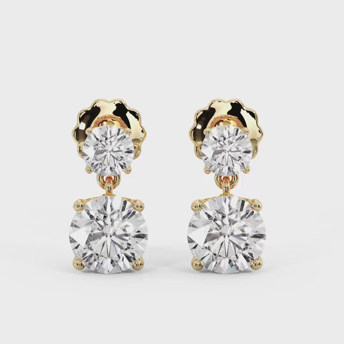 These exquisite earrings boast a sophisticated design, with two round diamonds suspended from a gold setting. The larger diamond is prominently displayed at the bottom, while the smaller one is nestled above it, creating a sense of depth and visual interest. The gold metalwork is expertly crafted, with a smooth, polished finish that catches the light.