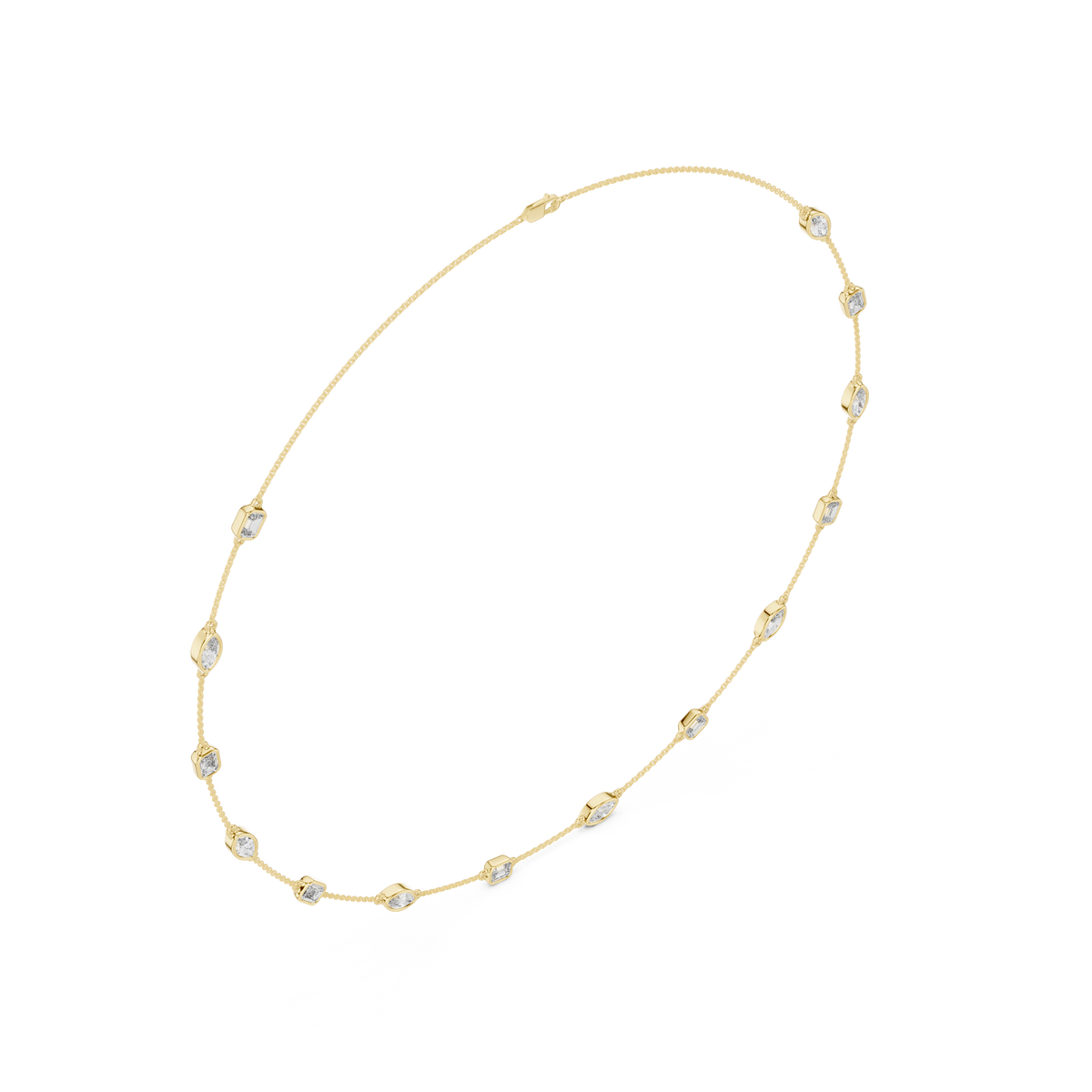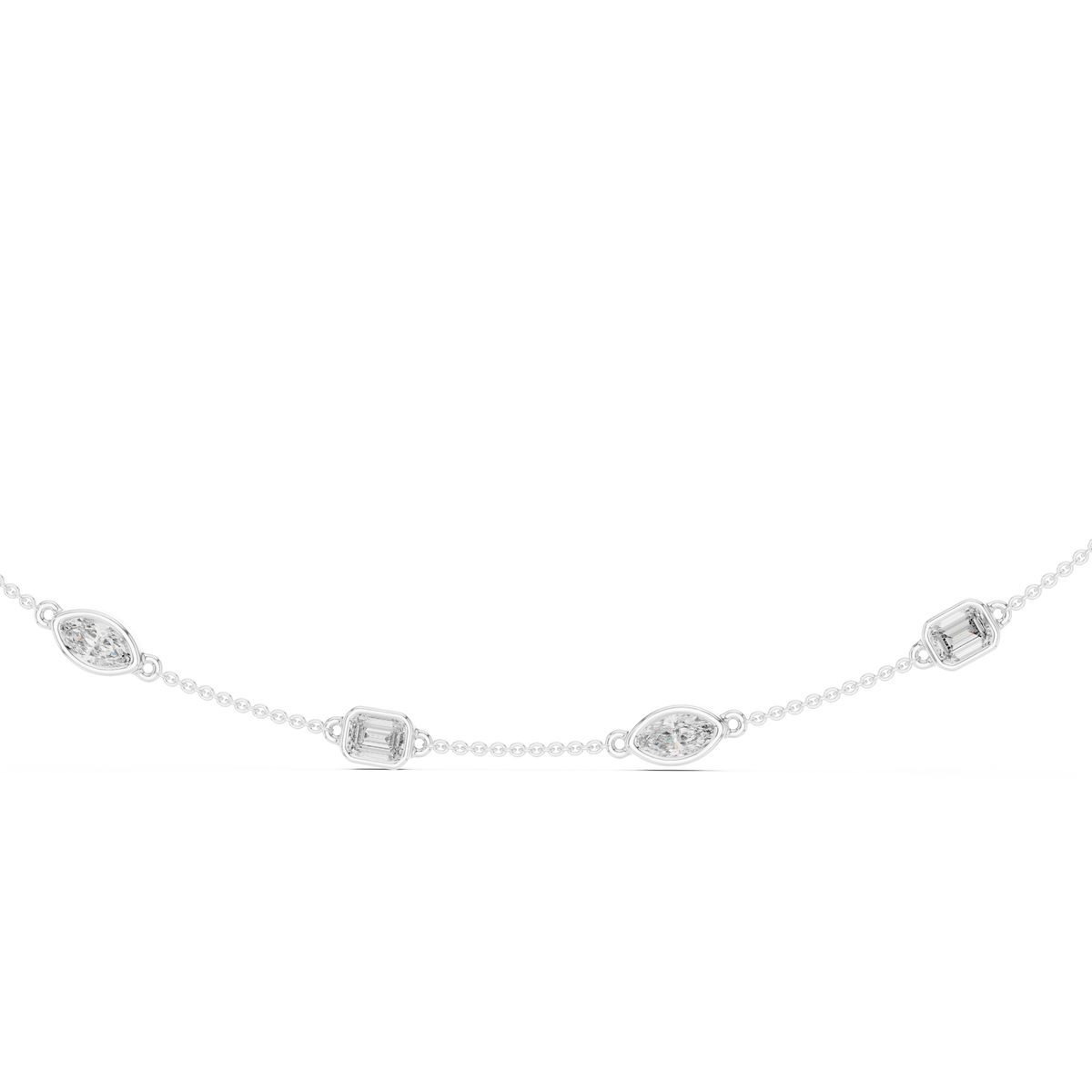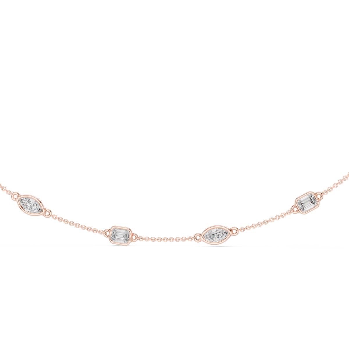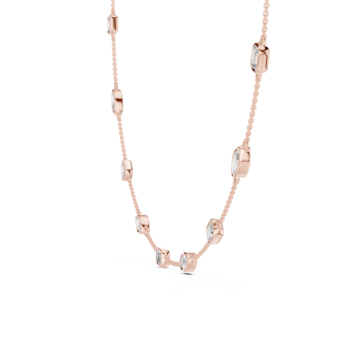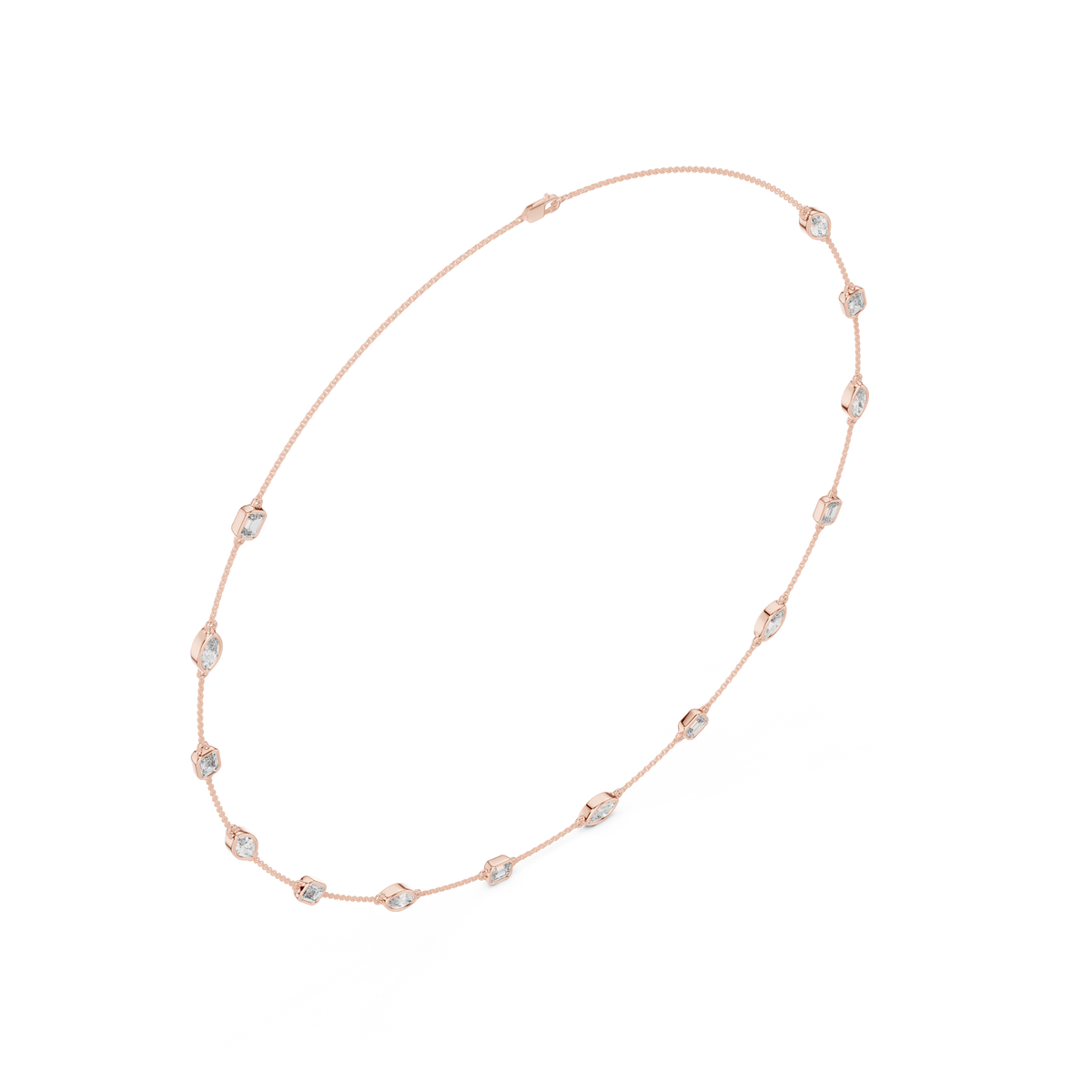 • The image showcases a stunning rose gold necklace featuring five diamonds, each with a distinct shape, set in a delicate chain. The diamonds are arranged in an alternating pattern of oval and emerald cuts, adding visual interest to the overall design. The rose gold setting complements the diamonds perfectly, creating a warm and elegant contrast. Against a crisp white background, the necklace takes center stage, highlighting its intricate details and craftsmanship. The overall effect is one of understated luxury, making this necklace a perfect choice for those seeking a sophisticated and eye-catching accessory.