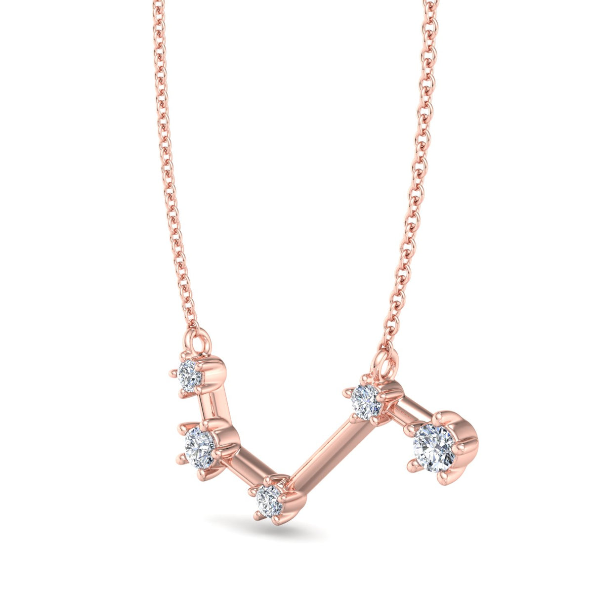 The necklace is crafted from gold and features a pendant in the shape of a constellation, with five diamonds set into it. The chain is delicate and dainty, making it suitable for everyday wear. The overall design is elegant and sophisticated, perfect for dressing up or adding a touch of glamour to a formal outfit.