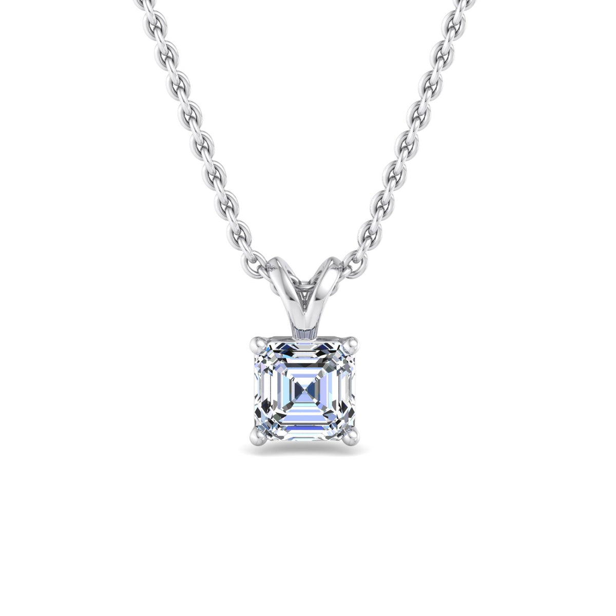 The image depicts a silver necklace featuring a pendant with a large, square-cut diamond or crystal. The pendant is securely held in place by four prongs and is suspended from a delicate silver chain, creating a sophisticated and luxurious look. The overall design exudes elegance, making it suitable for formal events or as a thoughtful gift. The simplicity of the chain allows the pendant to be the focal point, drawing attention to its intricate details and sparkle.