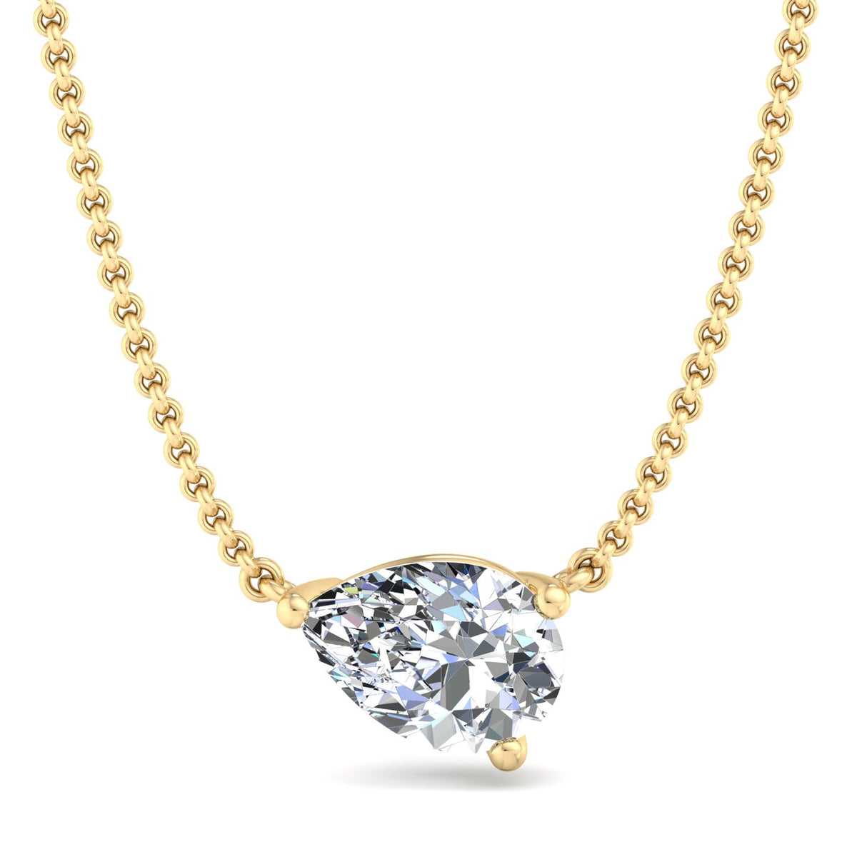 The image depicts a gold necklace featuring a large, teardrop-shaped diamond pendant. The chain is crafted from gold and boasts a delicate, interlocking link design. The pendant is securely set in a gold bezel setting, showcasing the diamond's facets as it catches the light.