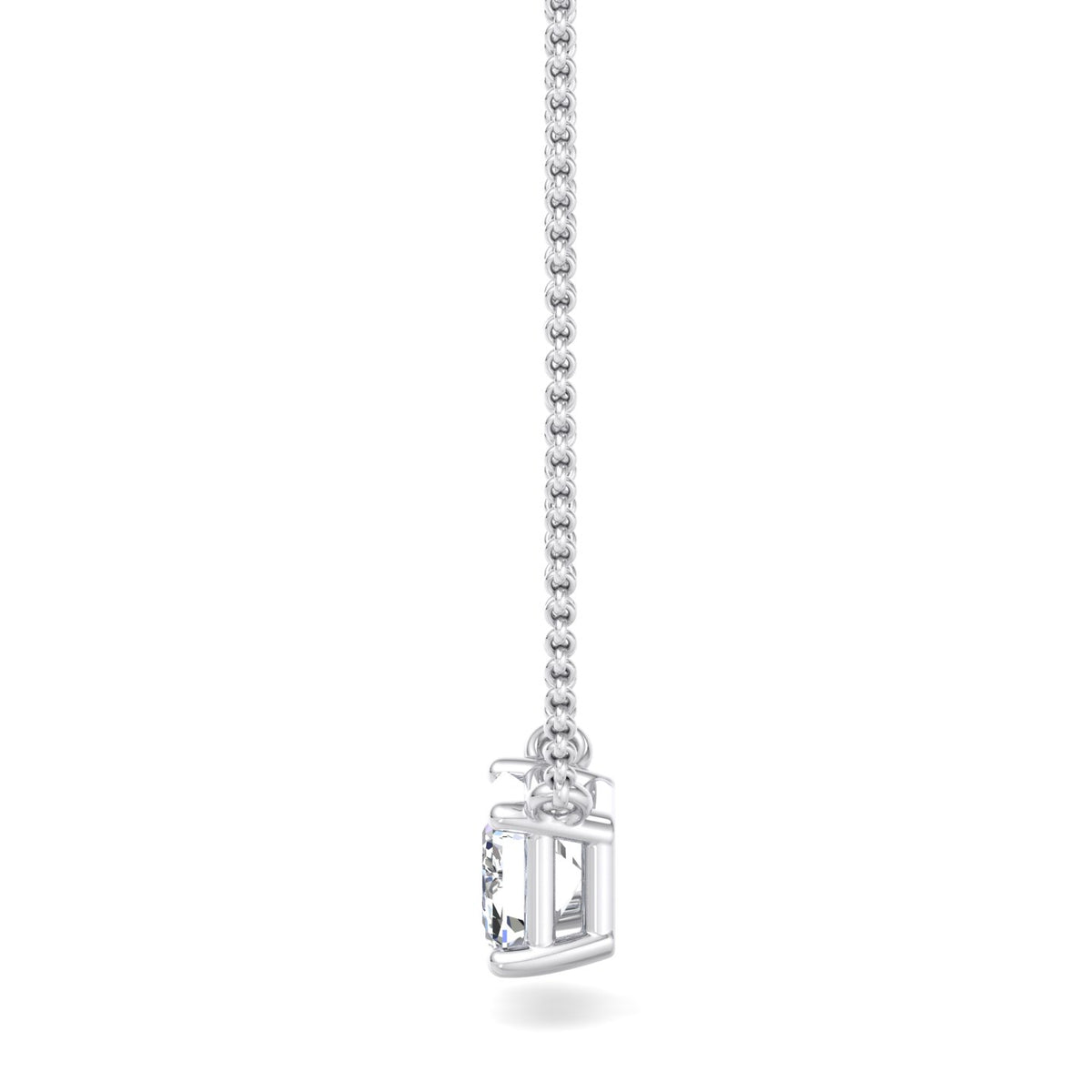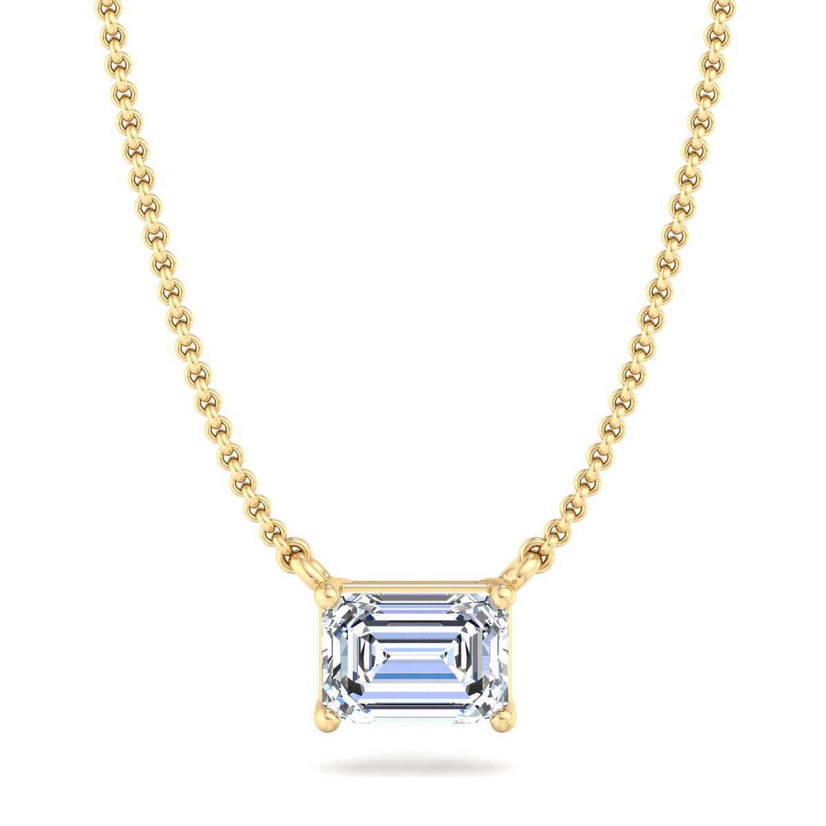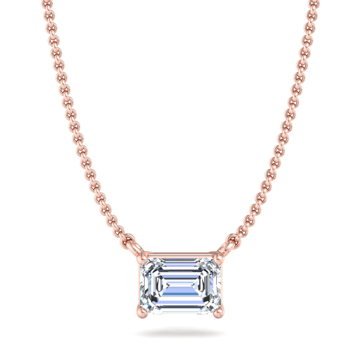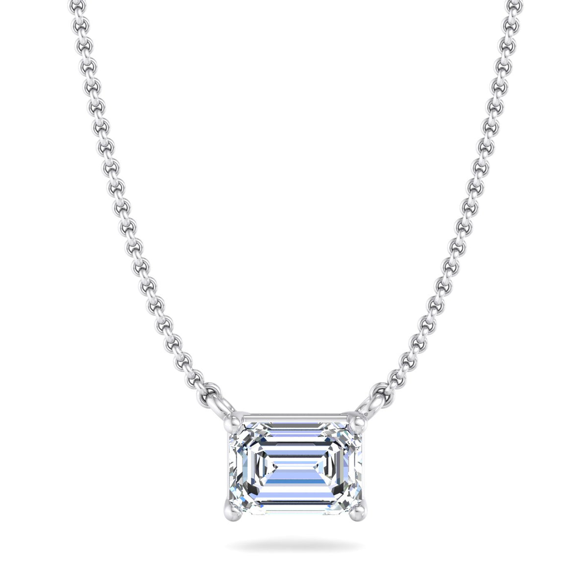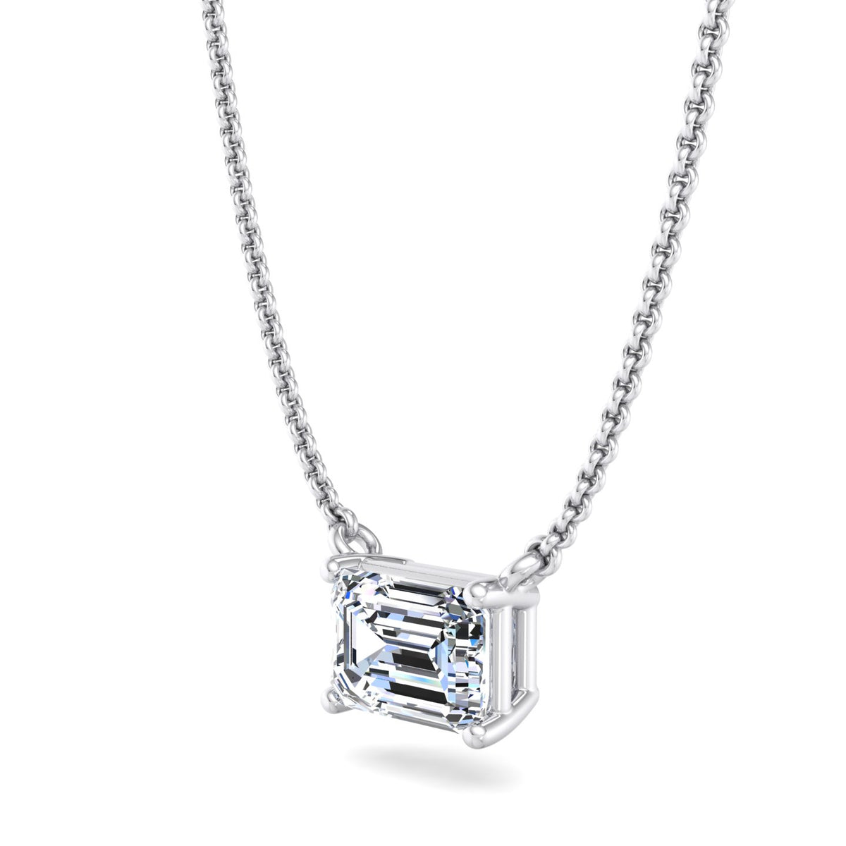 The image showcases a stunning silver necklace featuring a large, rectangular-cut diamond pendant. The diamond is securely held in place by four prongs and is suspended from a delicate silver chain. The overall design exudes elegance and sophistication, making it perfect for special occasions or as a luxurious gift.