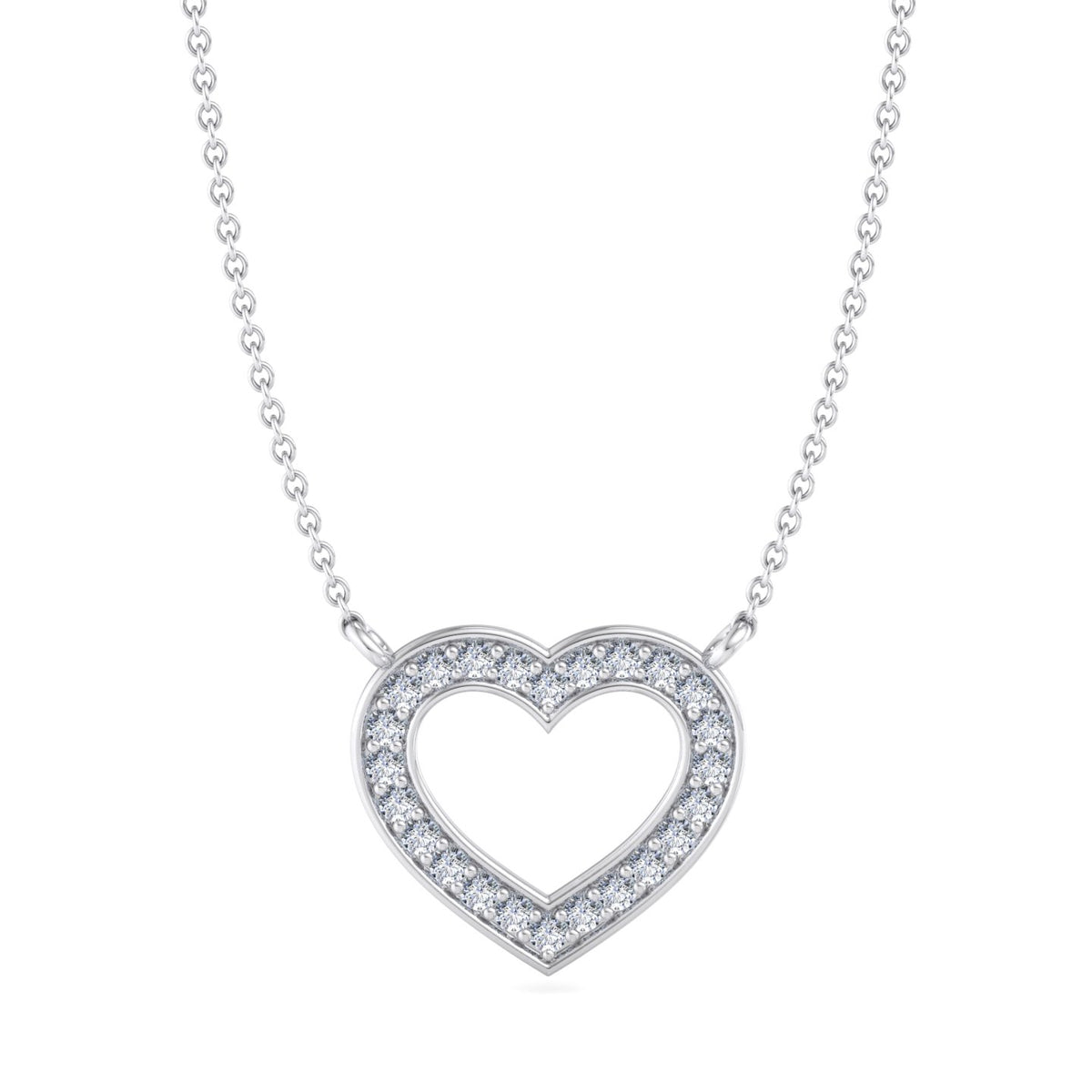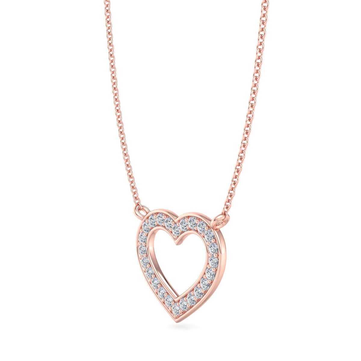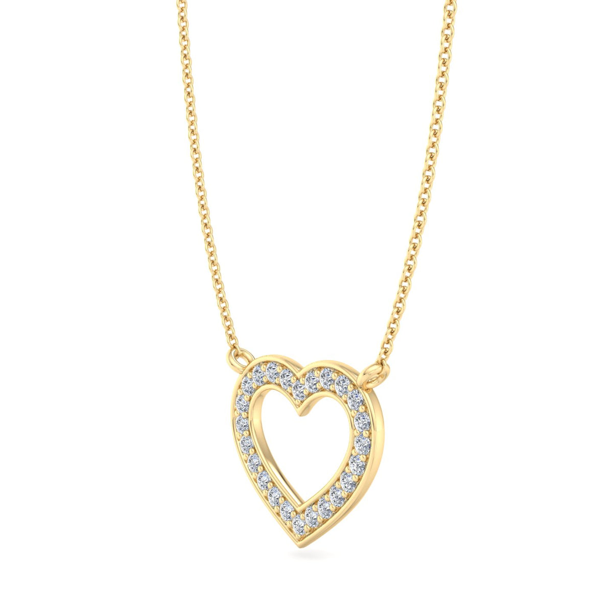 The necklace features a delicate gold chain and a heart-shaped pendant adorned with small diamonds, creating a beautiful and elegant piece of jewelry that exudes love and sophistication. The heart-shaped pendant is intricately designed with diamonds encrusted around its edges, adding a touch of luxury and refinement to the overall design. The combination of gold and diamonds creates a stunning contrast that catches the eye, making it a perfect accessory for any occasion.