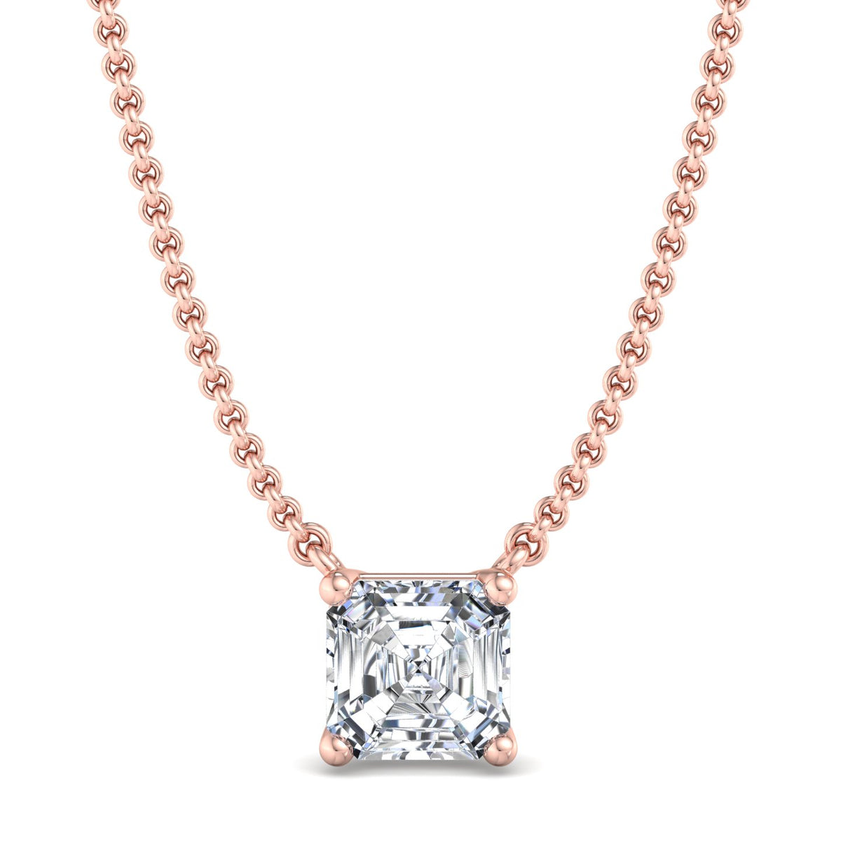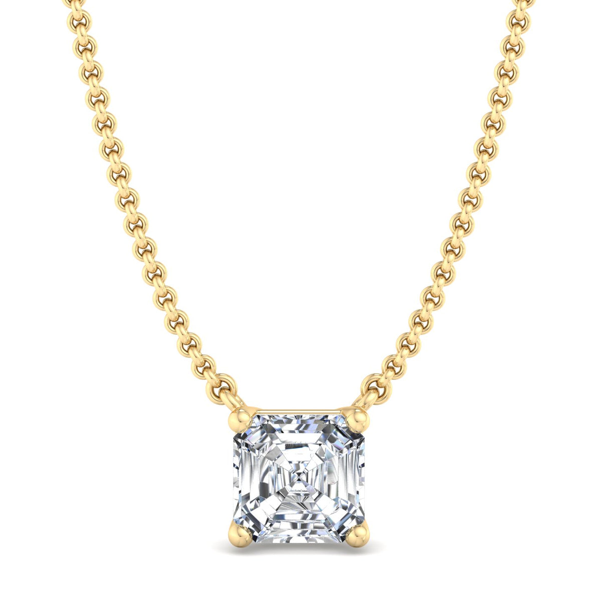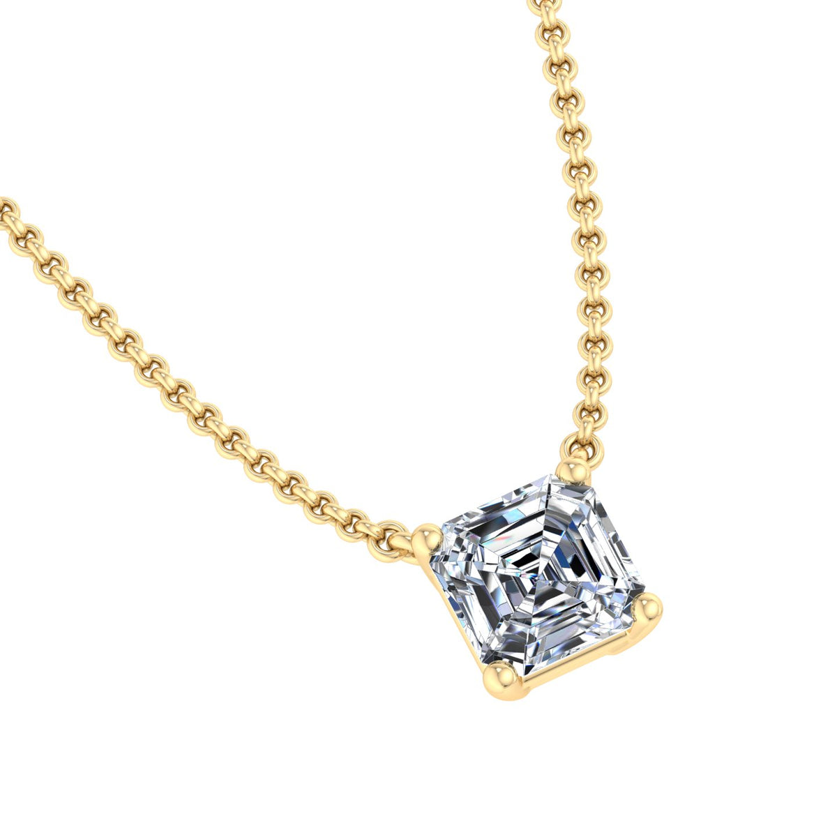 The image depicts a gold necklace featuring a large, clear gemstone pendant. The chain is crafted from gold and boasts a rope-like design, while the pendant showcases a substantial, square-cut gemstone securely held in place by four prongs. The gemstone's clarity and facets create a sense of depth and brilliance.