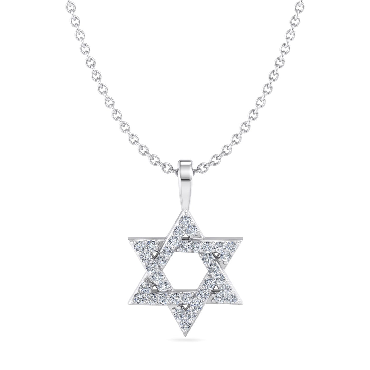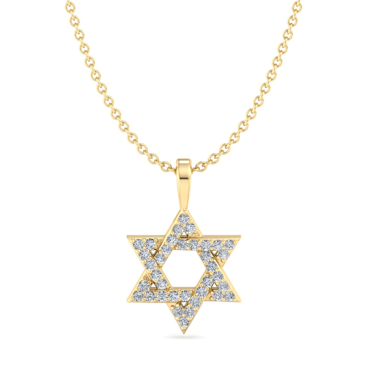 The image showcases a gold necklace featuring a Star of David pendant adorned with diamonds. The pendant is crafted from gold and boasts a six-pointed star design, with the interior of the star embellished with small diamonds. The chain is also made of gold and appears to be delicate in nature. The overall design exudes elegance and sophistication, making it a beautiful piece of jewelry suitable for various occasions.