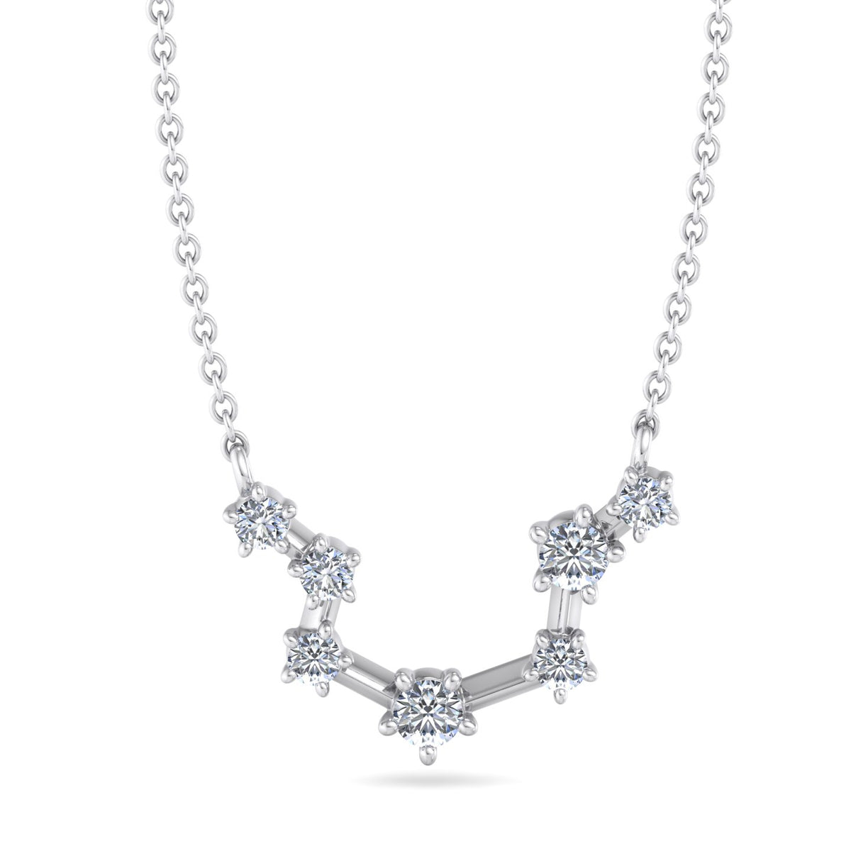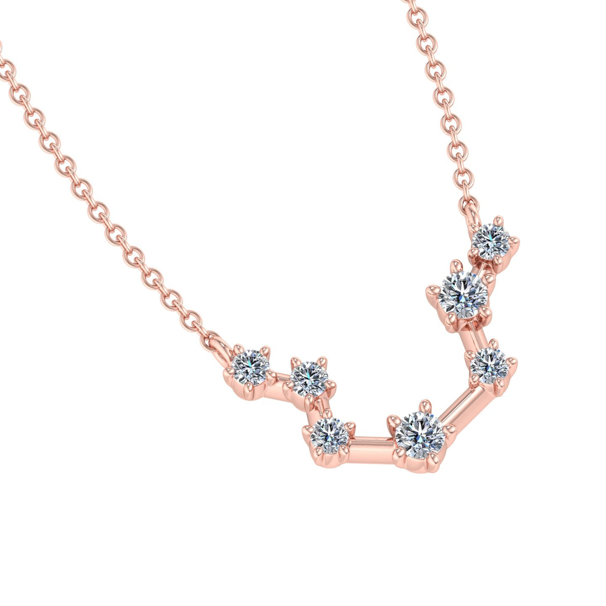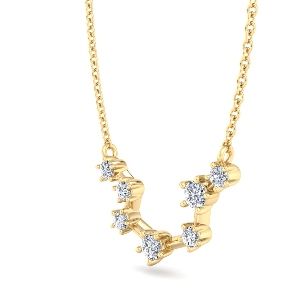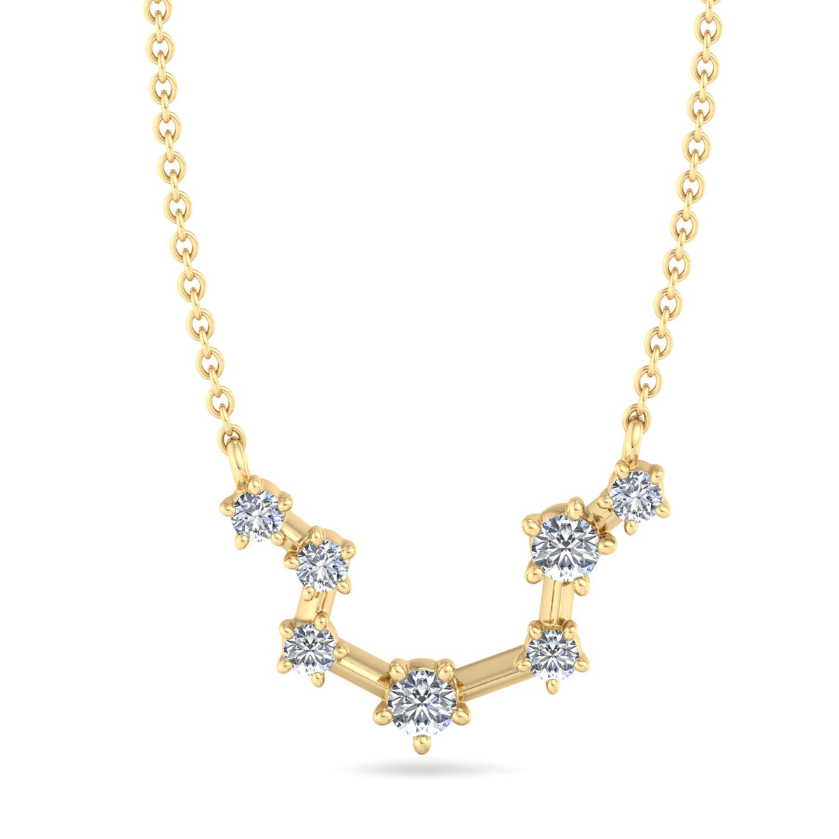 The image depicts a gold necklace featuring a pendant adorned with diamonds, set against a white background. The pendant is designed to resemble a crescent moon shape, with seven diamonds embedded within it.