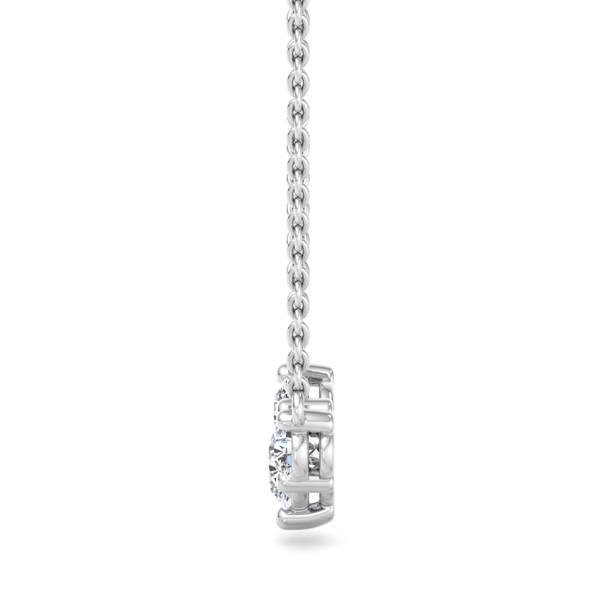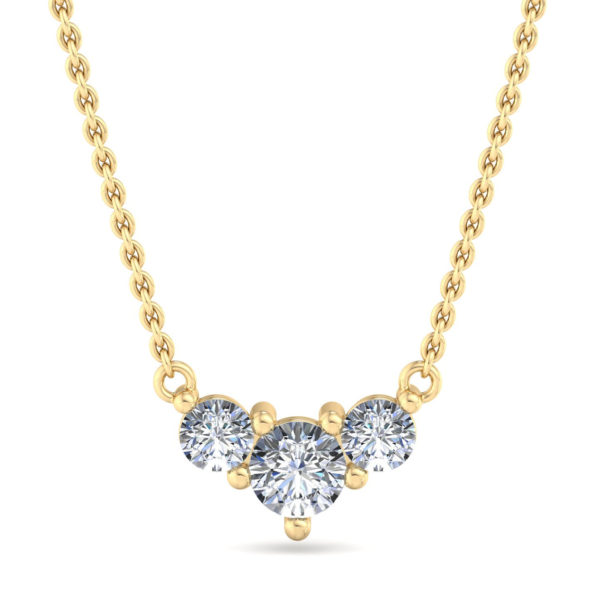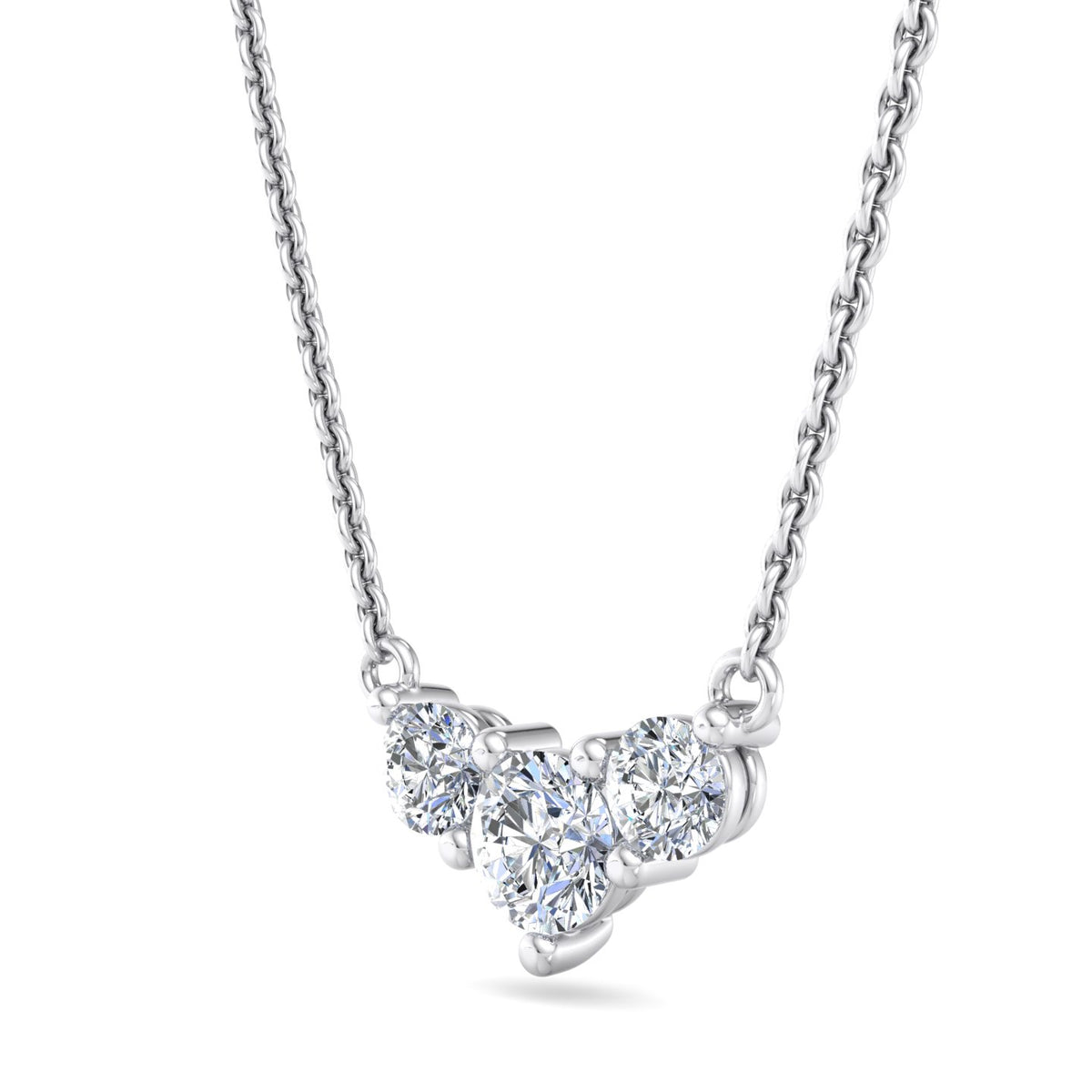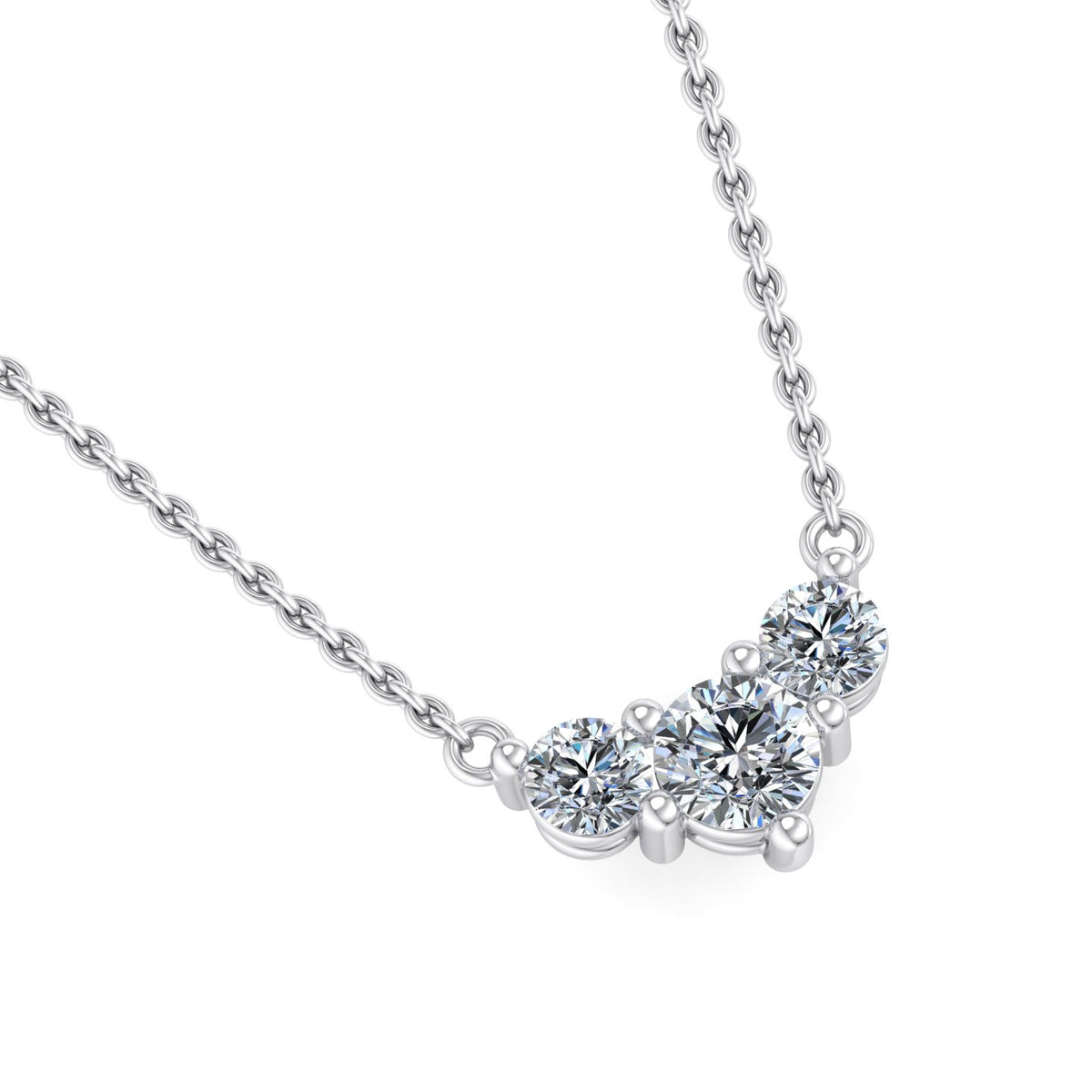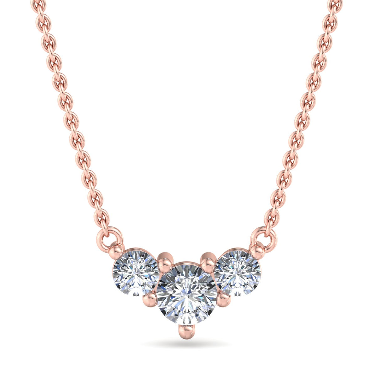 This necklace is a beautiful piece of jewelry that features three round diamonds set in a rose gold setting, suspended from a delicate rose gold chain. The diamonds are arranged in a curved line, creating a sense of movement and elegance. The rose gold tone adds a touch of warmth and sophistication to the overall design, making it suitable for formal or everyday wear.