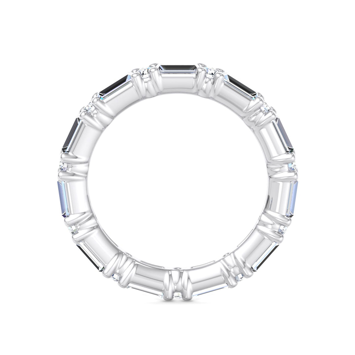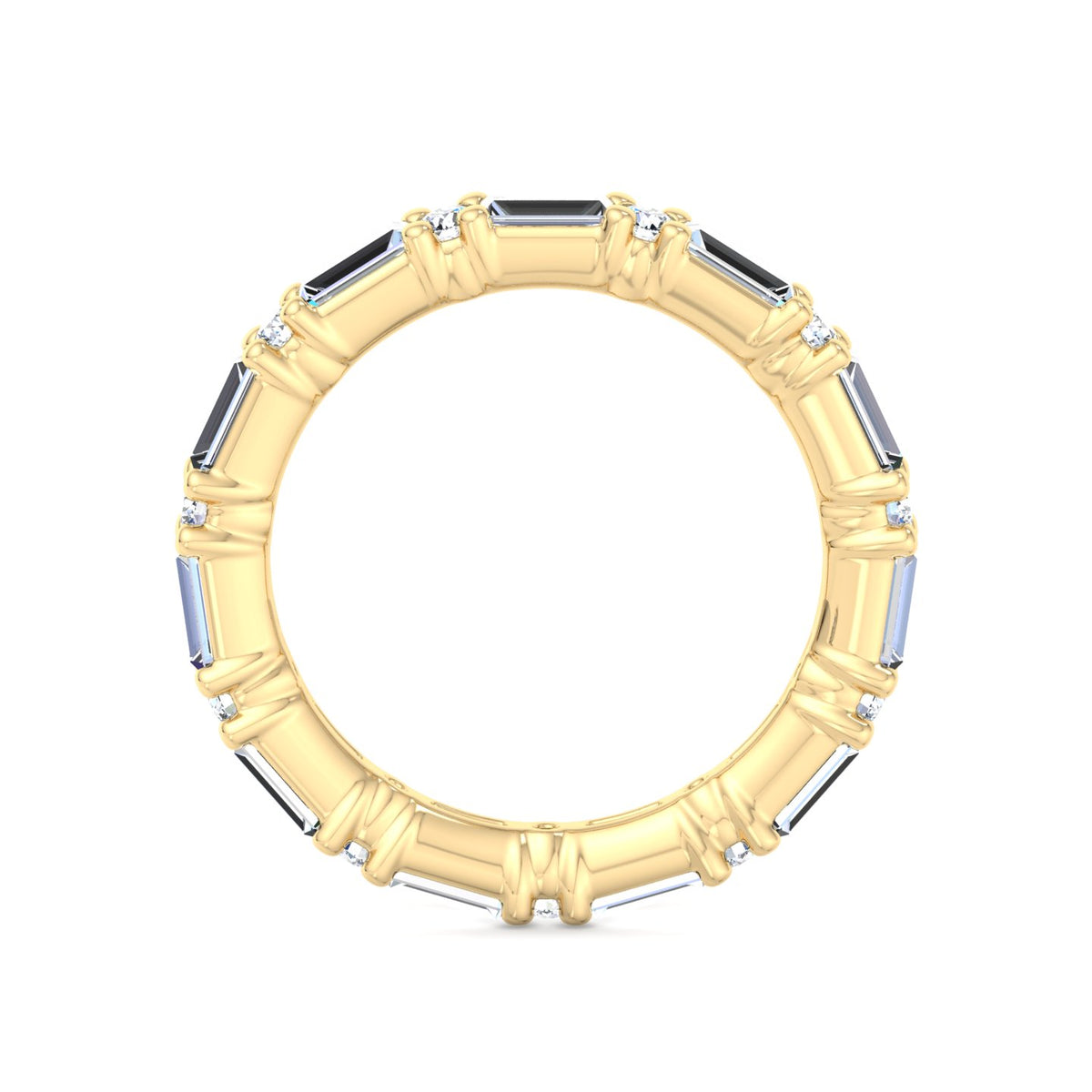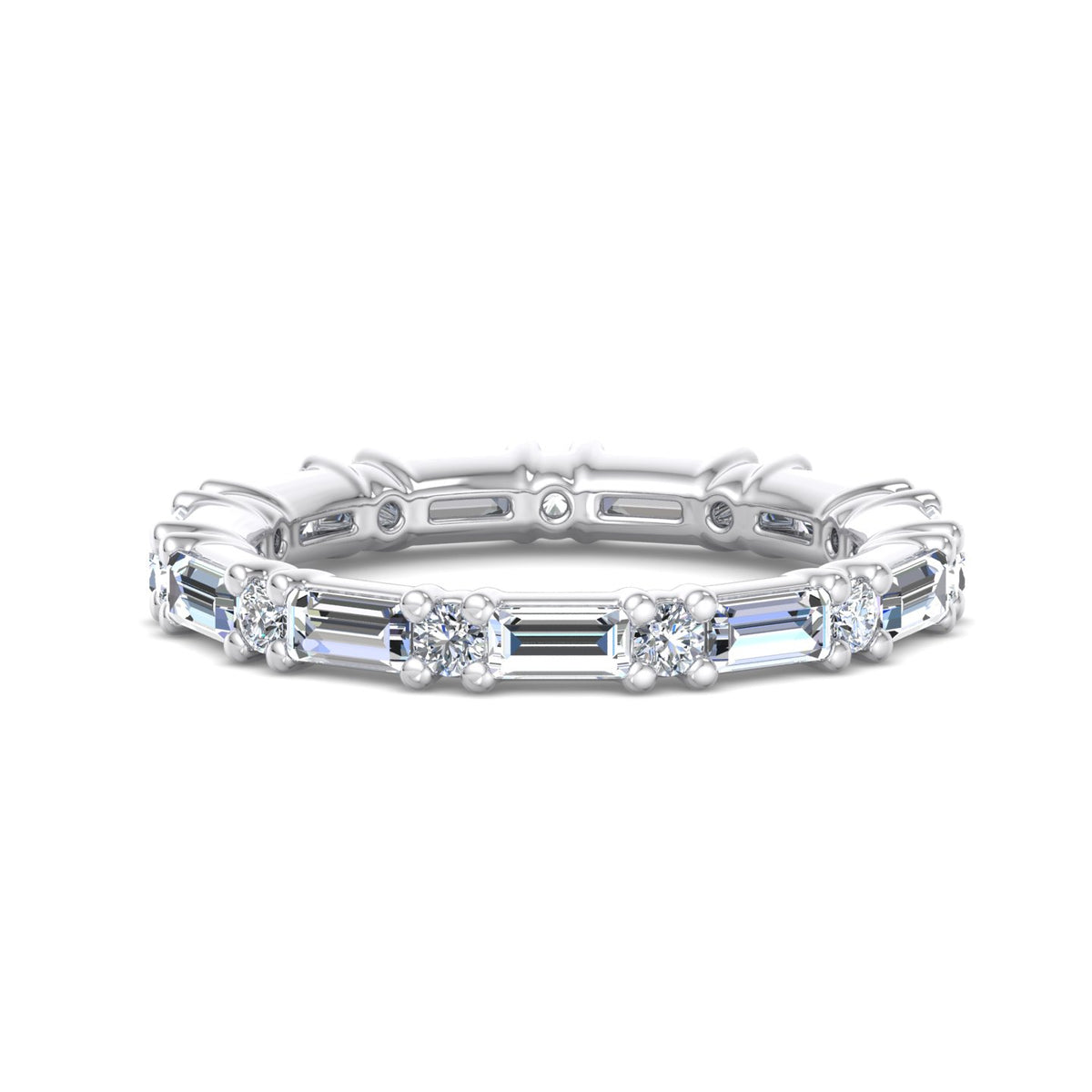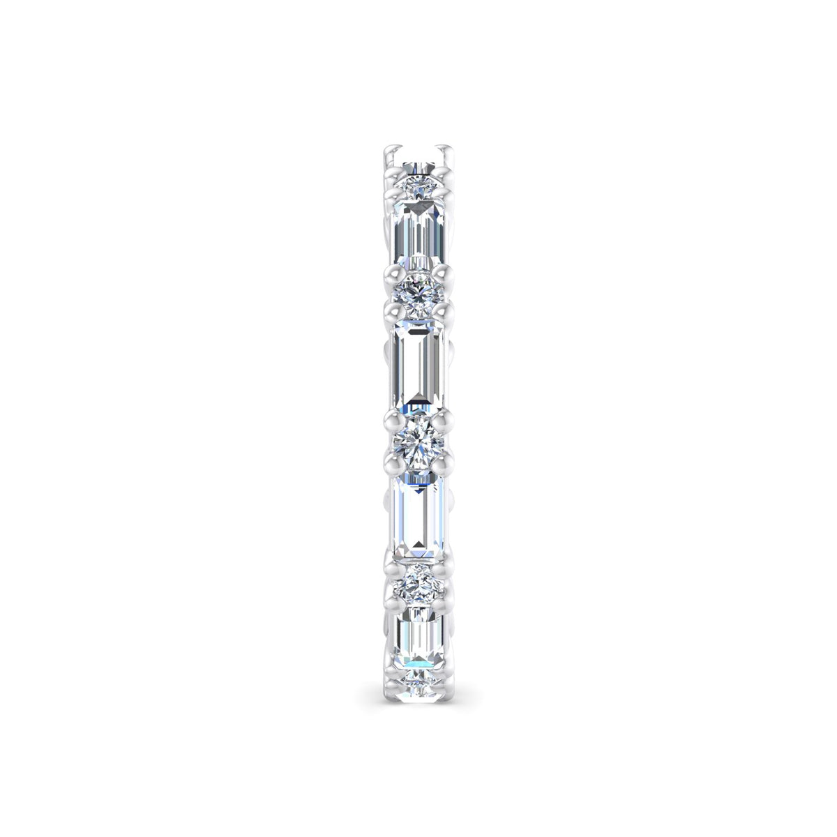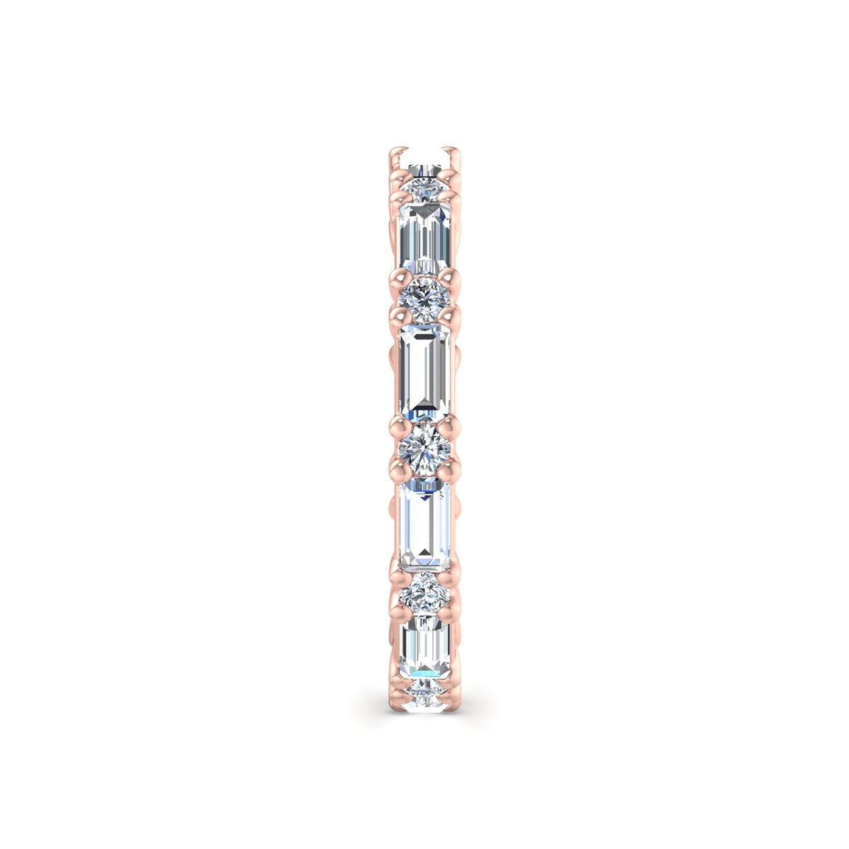 This exquisite eternity band ring is crafted from rose gold and adorned with a combination of round and baguette-cut diamonds. The ring's design features a continuous pattern of diamonds around its circumference, creating a stunning visual effect. The use of rose gold adds a touch of warmth and elegance to the overall design, while the diamonds provide a luxurious sparkle. The eternity band style makes it suitable for everyday wear, symbolizing eternal love and commitment.