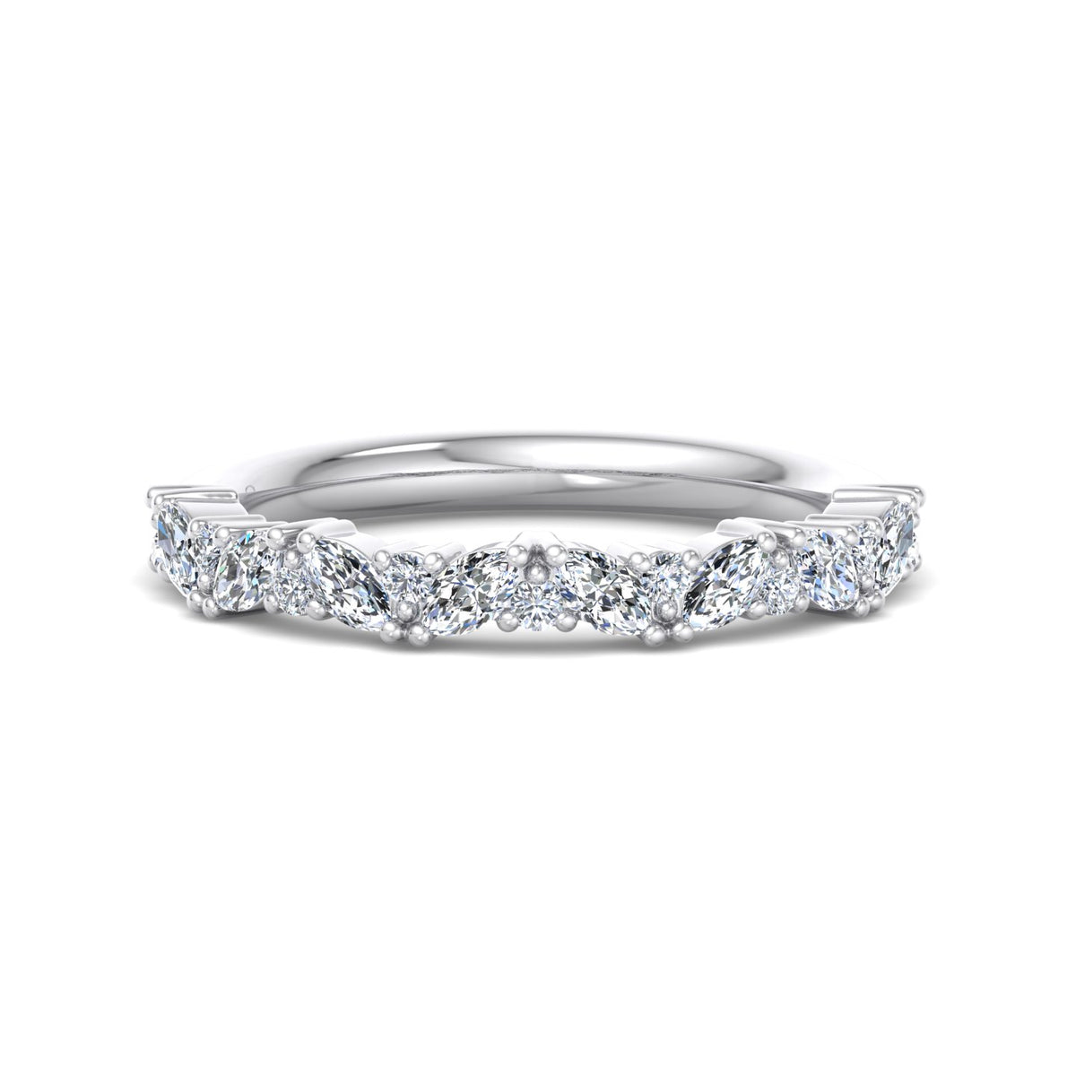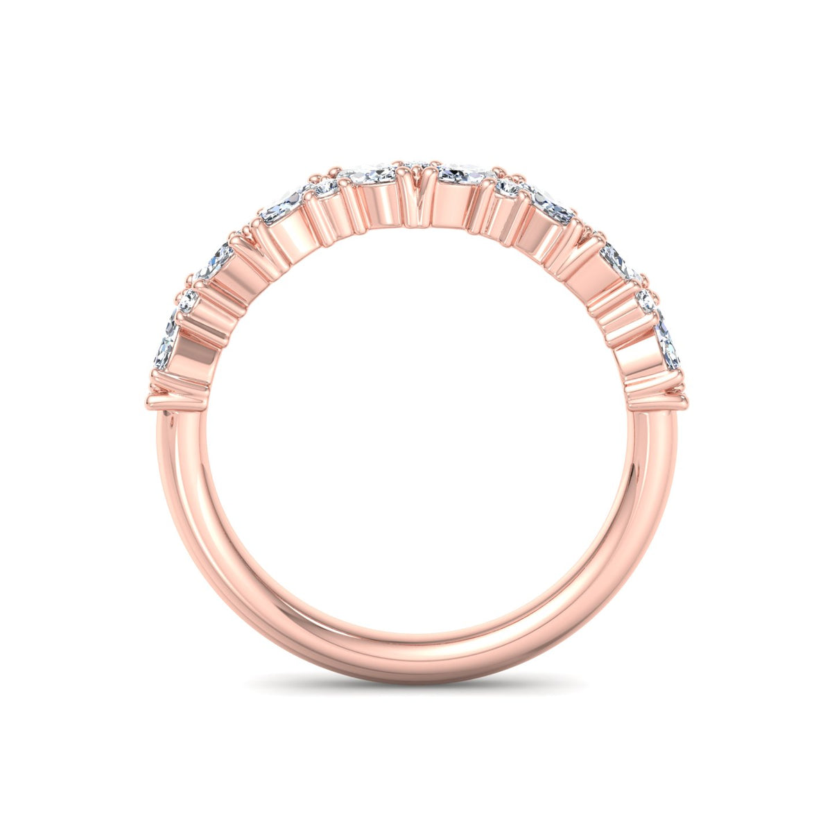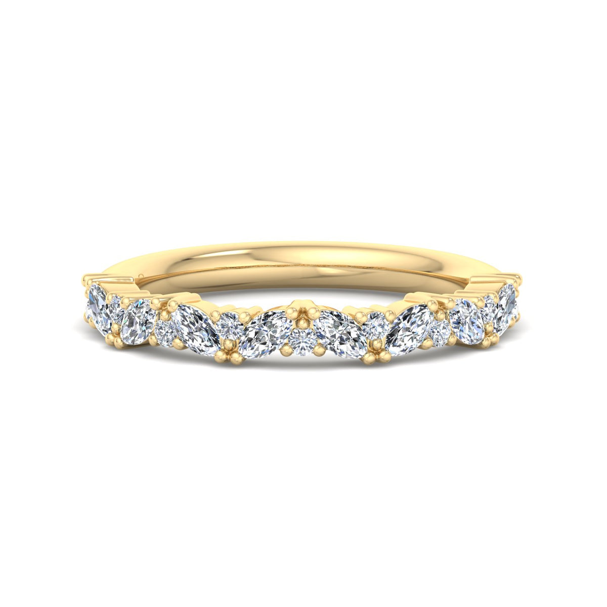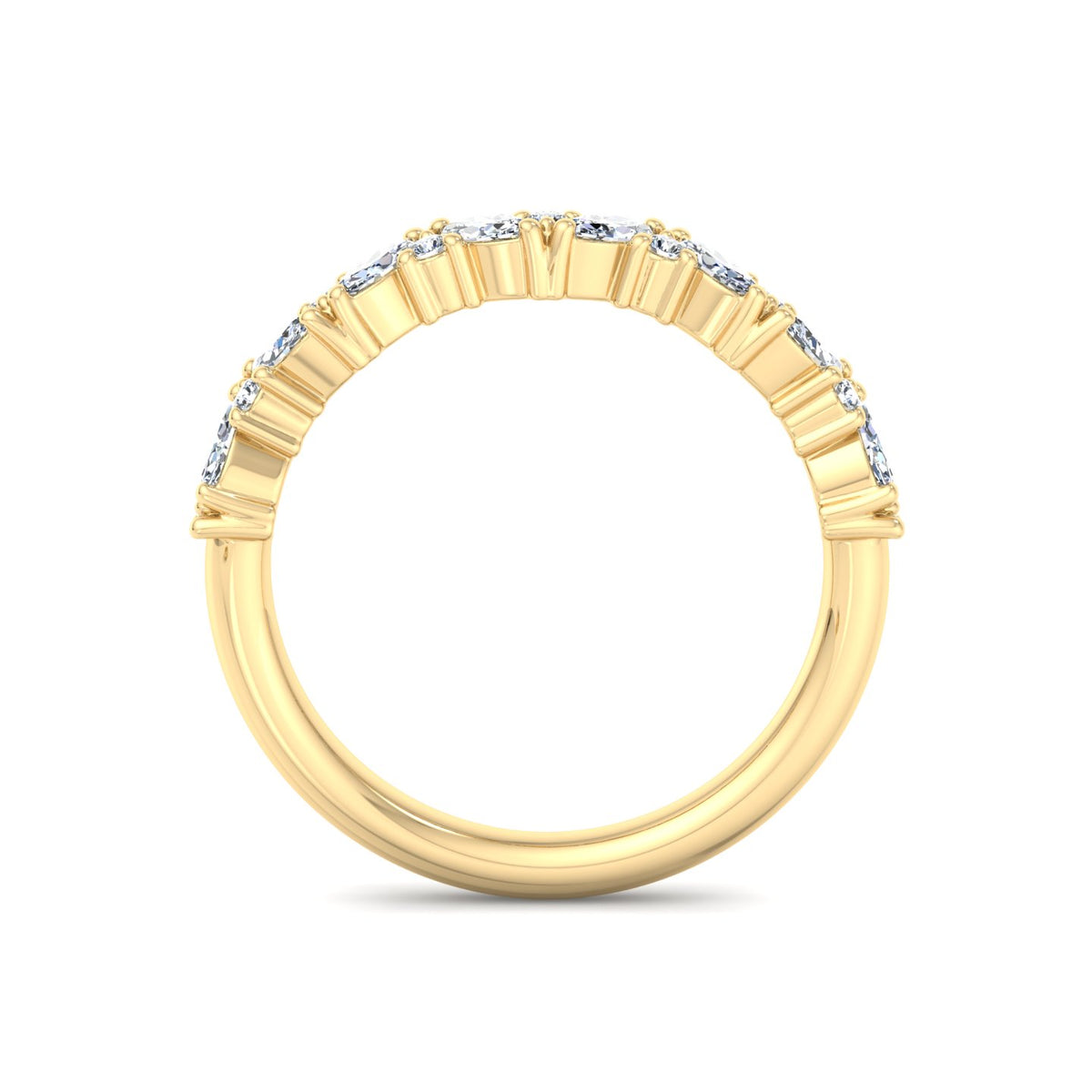 This exquisite eternity band showcases seven marquise-cut diamonds, expertly arranged along the band. The diamonds are held in place by delicate prongs, adding to the ring's elegance. The yellow gold band provides a warm and luxurious backdrop for the sparkling diamonds, making it an ideal choice for those seeking a sophisticated and timeless piece of jewelry.