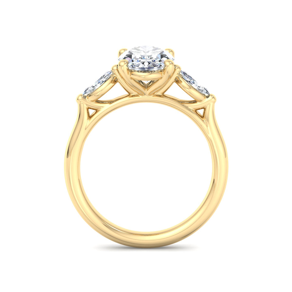 The image depicts a gold ring featuring a large oval-cut diamond as its centerpiece, flanked by two smaller oval-cut diamonds on either side. The ring's band is crafted from yellow gold and boasts a smooth, polished finish.