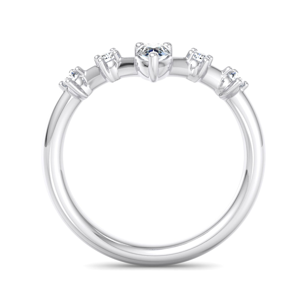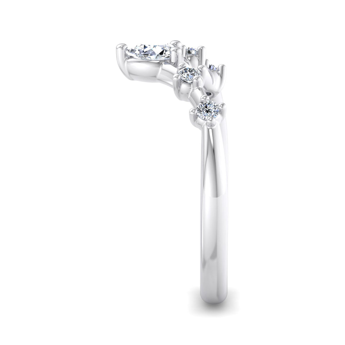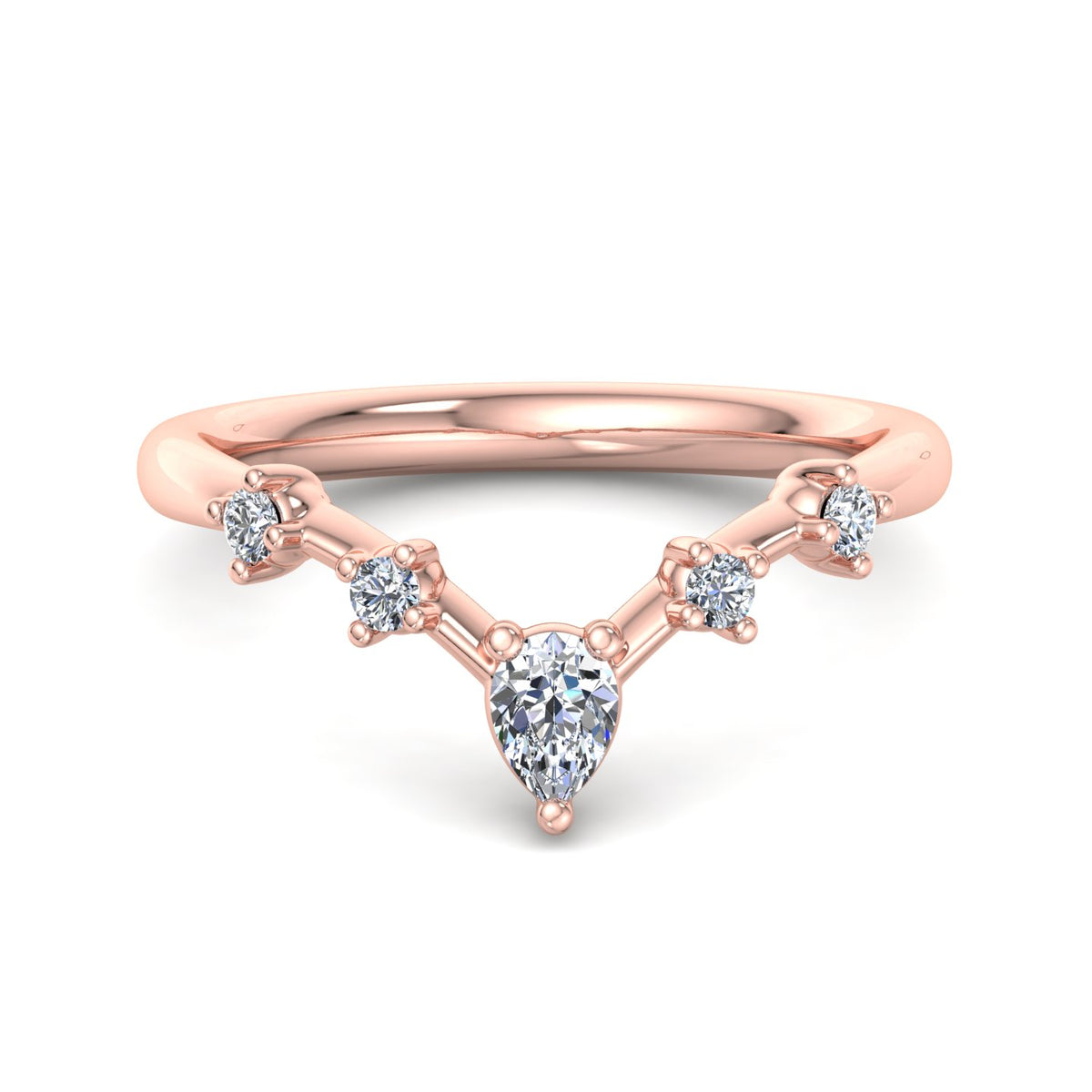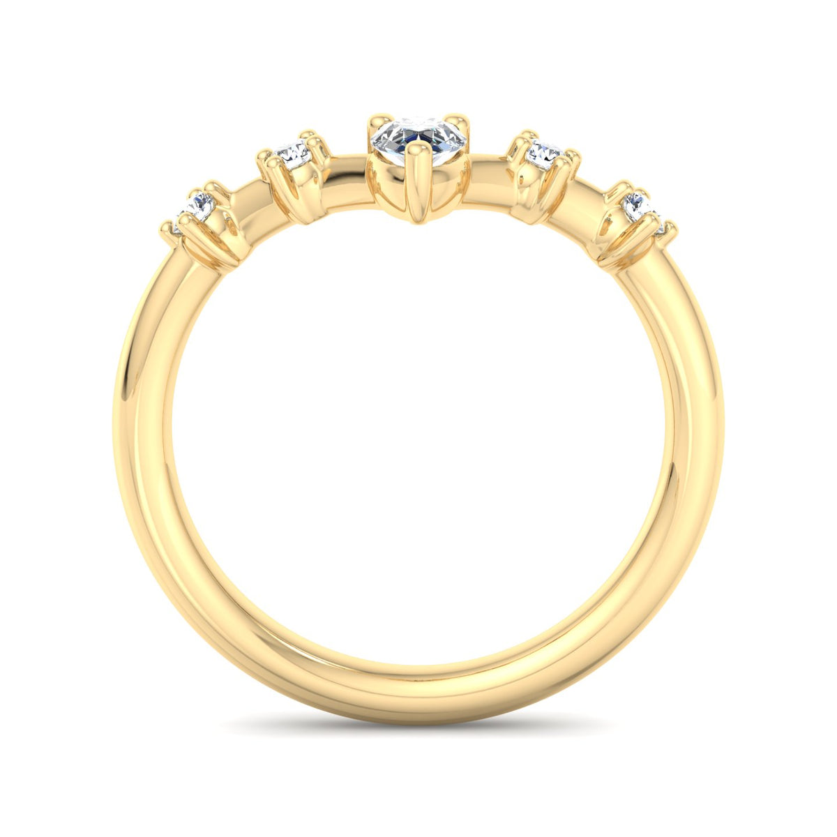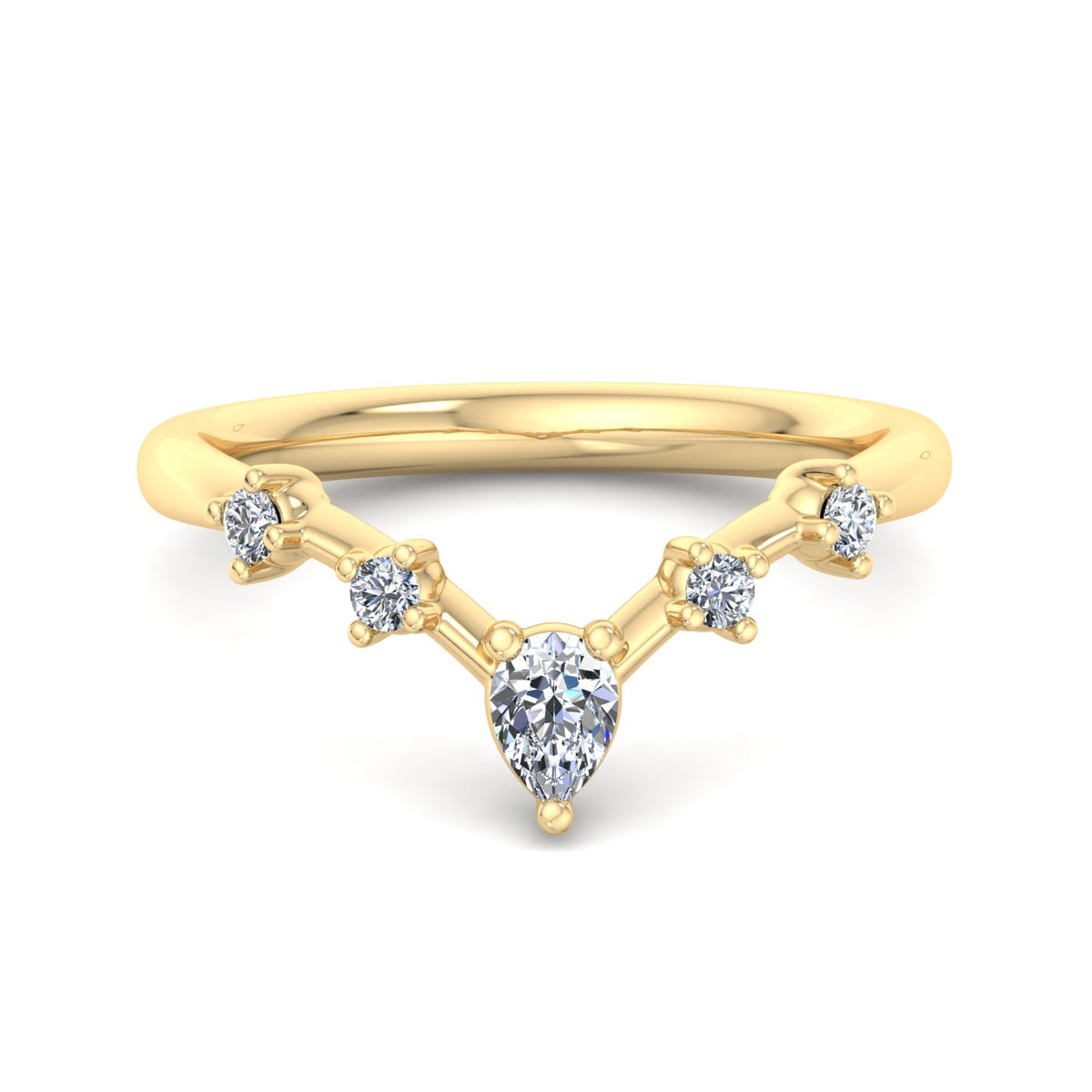 The ring features a teardrop-shaped diamond as its centerpiece.Four smaller round diamonds are set on either side of the teardrop diamond, creating a sense of symmetry and balance.The band is made of gold, which adds a touch of luxury and sophistication to the overall design.The ring's simple yet elegant design makes it suitable for everyday wear or as a special occasion piece.