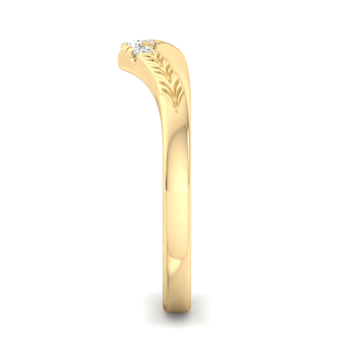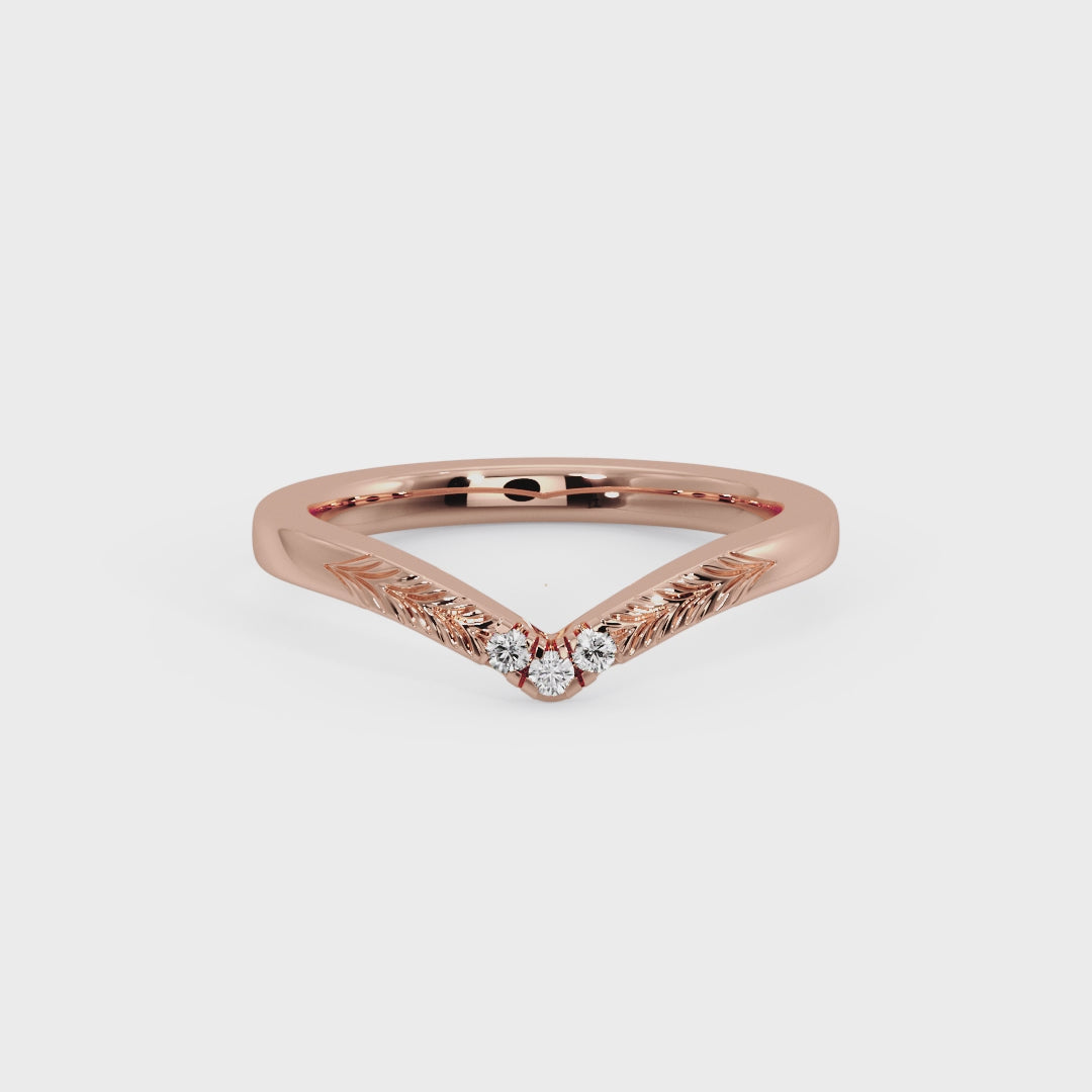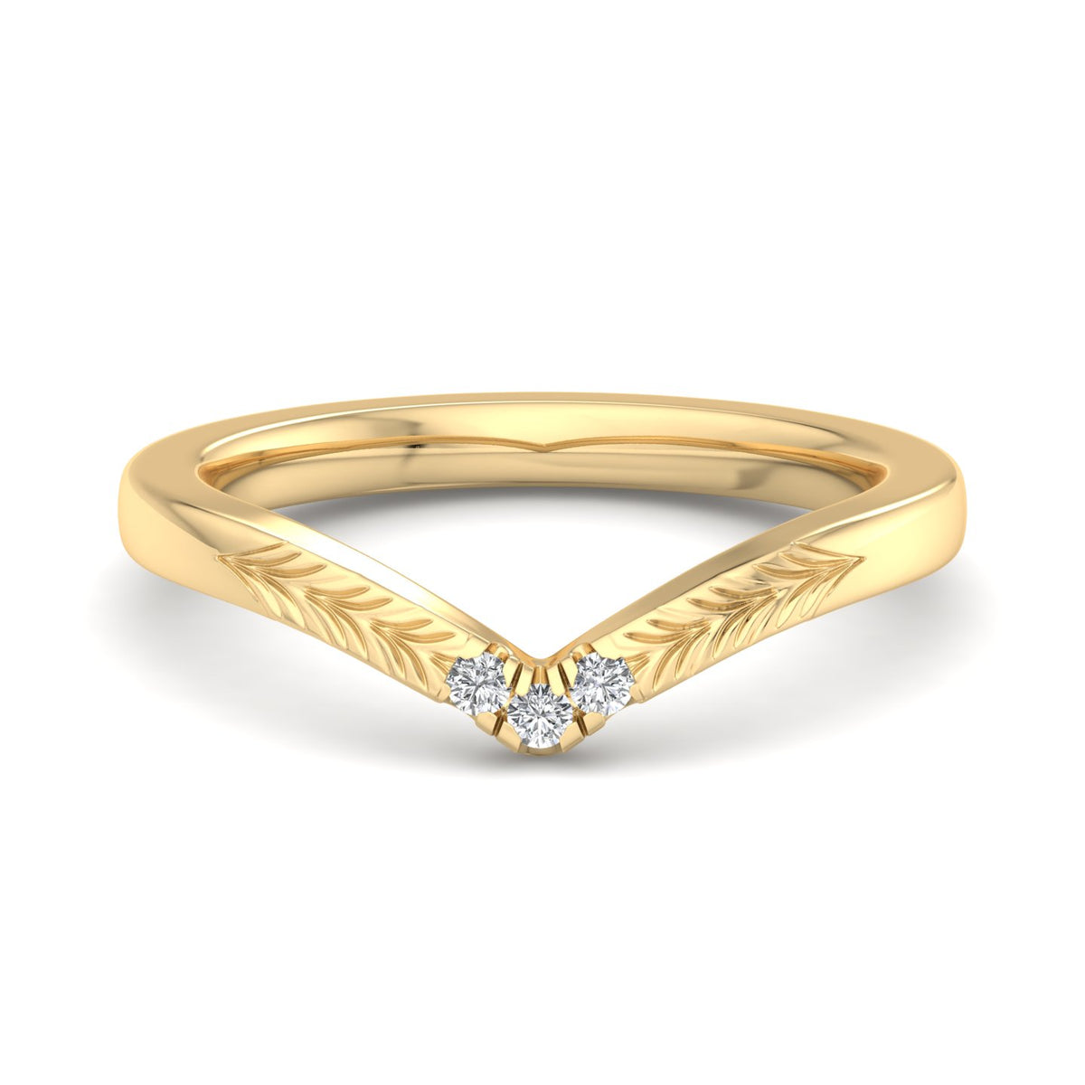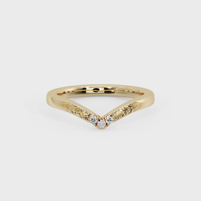 The Trinity V-Ring is a stunning gold ring featuring a unique V-shaped design adorned with three sparkling diamonds. Crafted from high-quality yellow gold, this ring boasts an elegant engraved leaf pattern on its band, adding a touch of sophistication to its overall aesthetic. The V-shape is created by two bands that converge at the front, where three round diamonds are carefully set, creating a beautiful focal point.