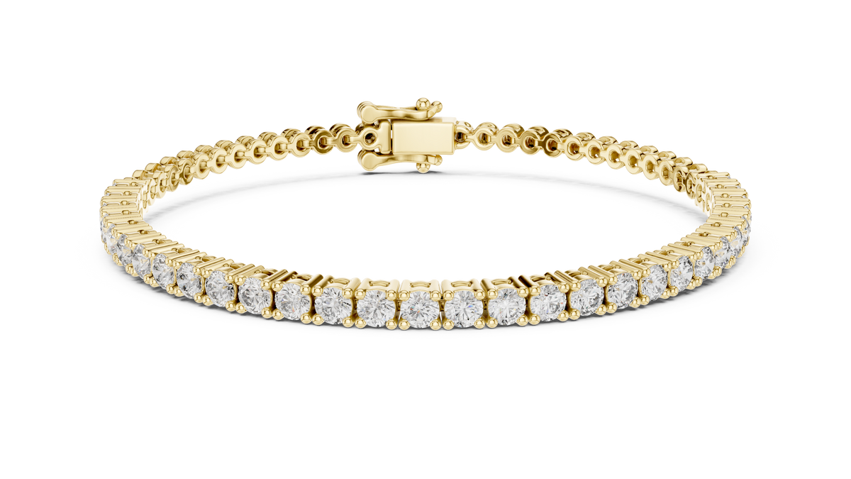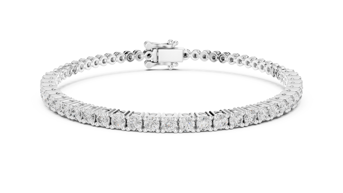• This elegant diamond tennis bracelet features a line of round brilliant diamonds set in a four-prong setting, creating a continuous sparkle around the wrist. The diamonds are securely held in place by silver or white gold prongs, and the bracelet is fastened with a secure clasp. The overall design exudes luxury and sophistication, making it an ideal accessory for formal occasions or as a special gift.