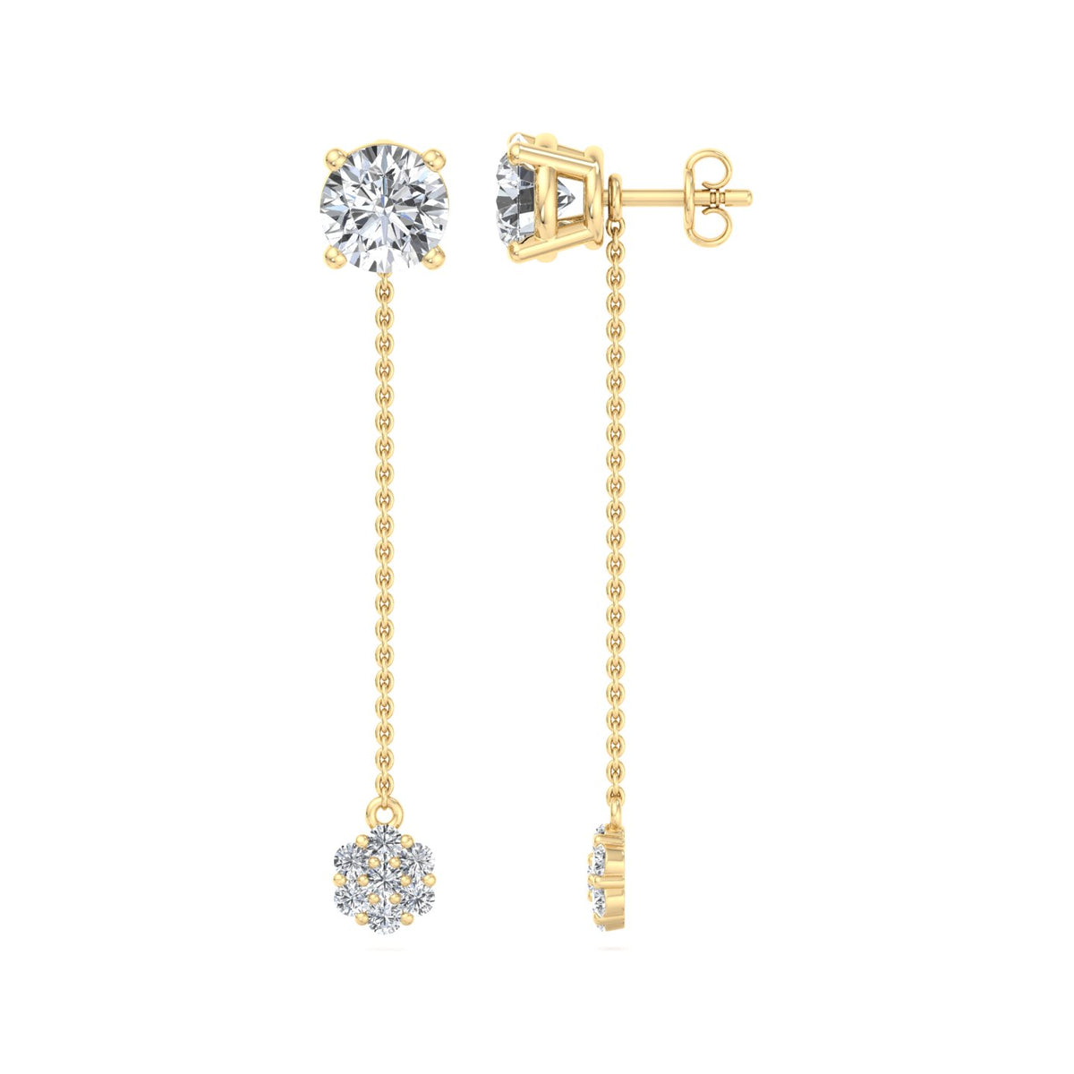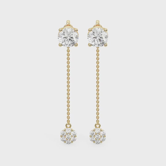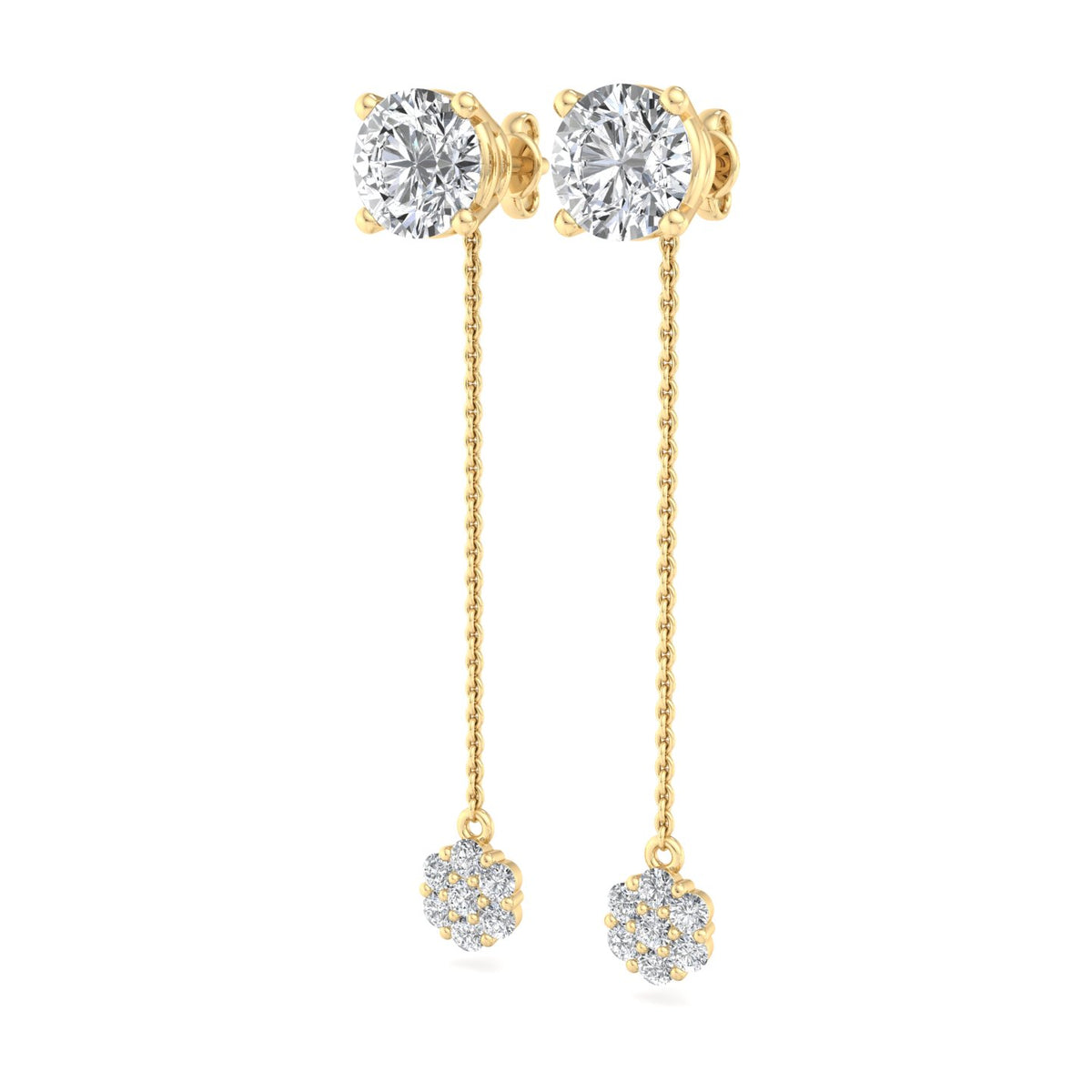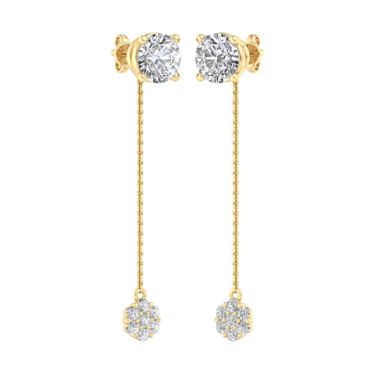 These exquisite earrings boast a sophisticated design, with round diamonds securely set in gold prongs at the top. Delicate gold chains suspend heart-shaped diamond drops, adding a touch of whimsy and romance. The combination of round and heart-shaped diamonds creates a visually appealing contrast, making these earrings perfect for dressing up or adding a touch of luxury to everyday wear.