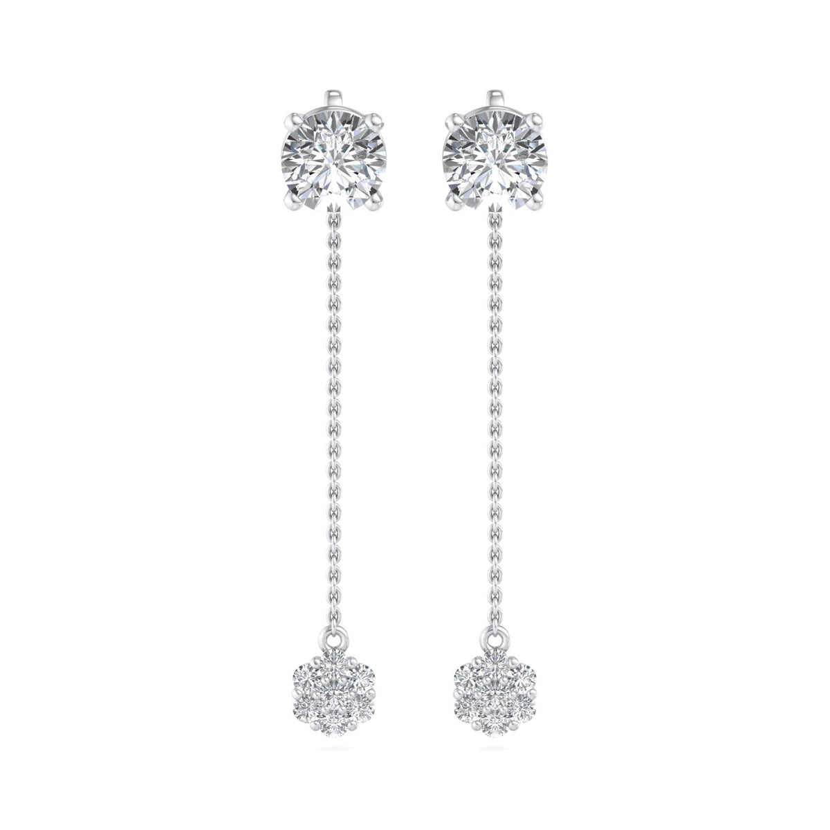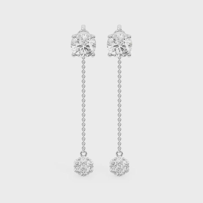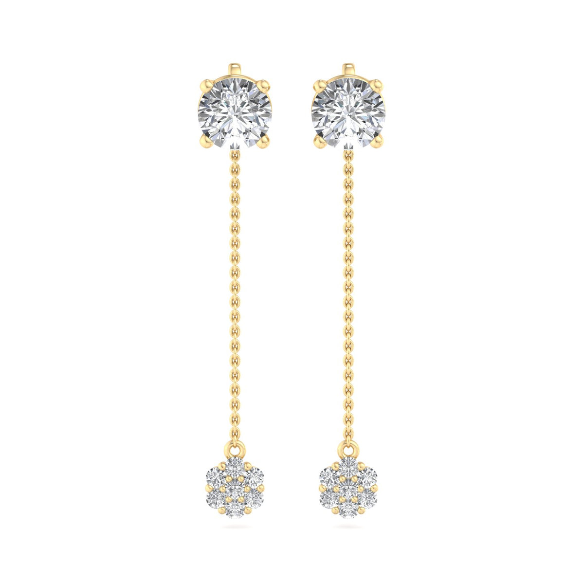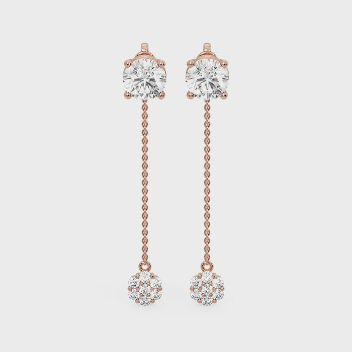These exquisite earrings boast a sophisticated design, with round diamonds securely set in gold prongs at the top. Delicate gold chains suspend heart-shaped diamond drops, adding a touch of whimsy and romance. The combination of round and heart-shaped diamonds creates a visually appealing contrast, making these earrings perfect for dressing up or adding a touch of luxury to everyday wear.
