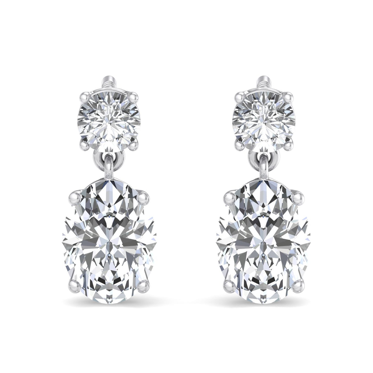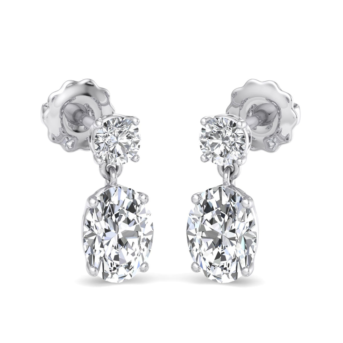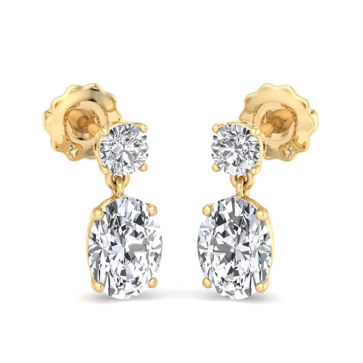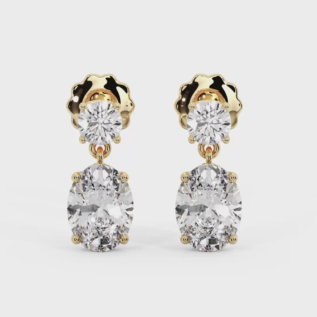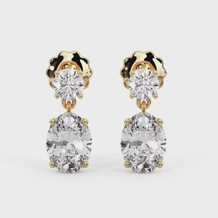 These exquisite earrings showcase a harmonious blend of classic design and luxurious materials. The gold setting provides a sophisticated backdrop for the two prominent gemstones, which are expertly cut to maximize their brilliance. The smaller round-cut stone at the top adds a touch of subtle elegance, while the larger oval-cut stone below creates a striking focal point. The four-prong setting ensures that both stones are securely fastened, allowing them to shine with optimal clarity. Perfect for formal occasions or as a special gift, these Double Diamond Drop Earrings exude refinement and poise