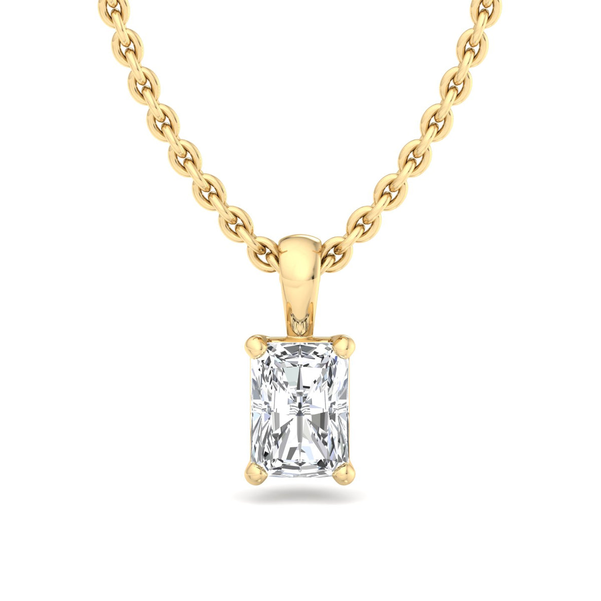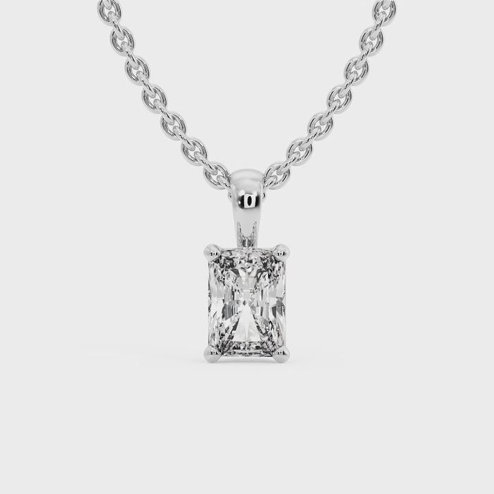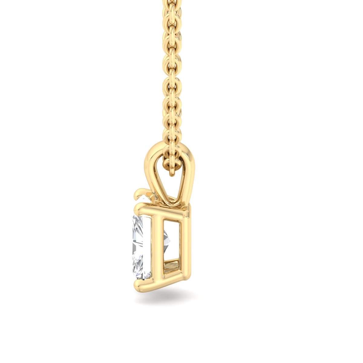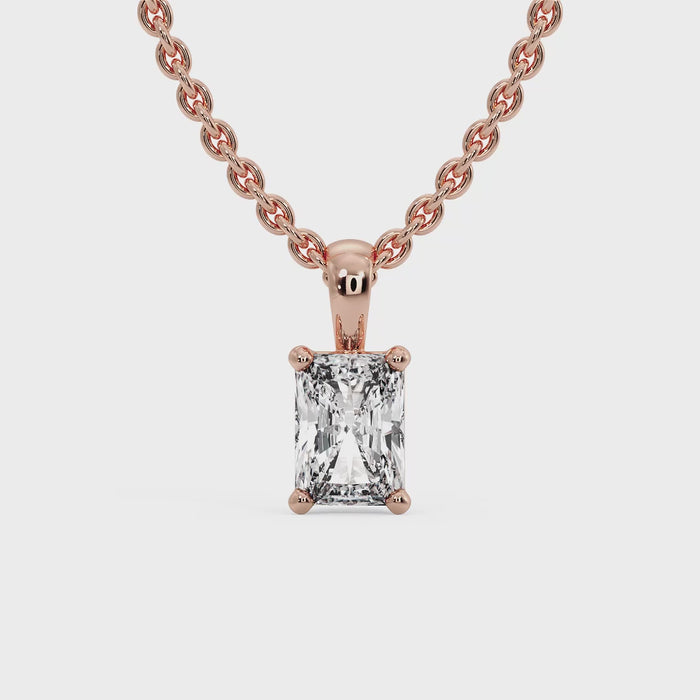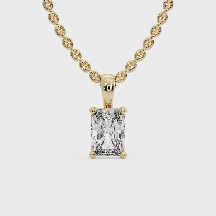 Brilliance meets bold geometry in the Celestial Flame Pendant. Featuring a radiant-cut diamond encased in a sturdy four-prong setting, this pendant balances modern edge with timeless elegance. The fiery facets of the diamond glow effortlessly against the warmth of a yellow gold chain—perfect for everyday luxury or unforgettable moments.
